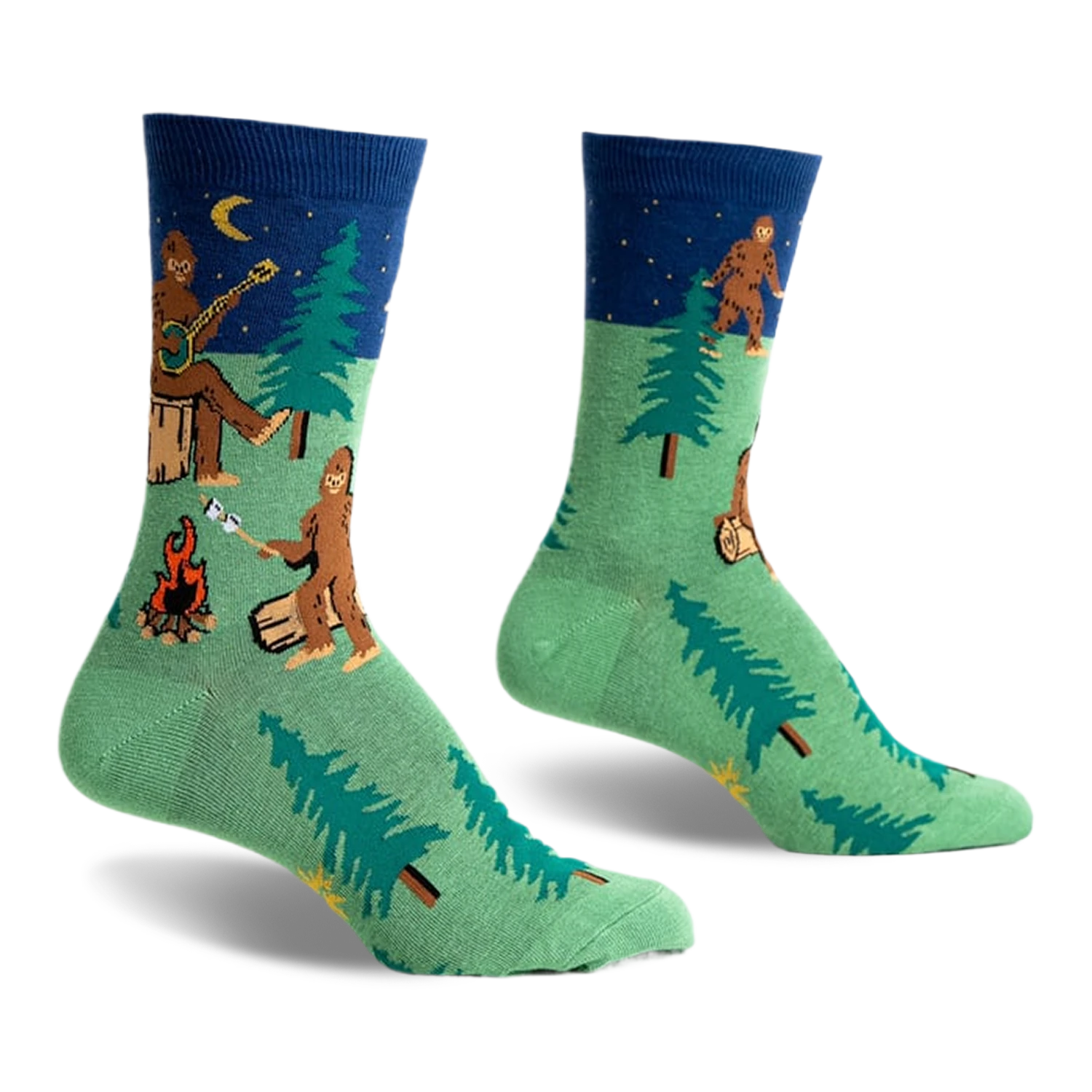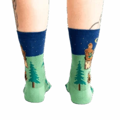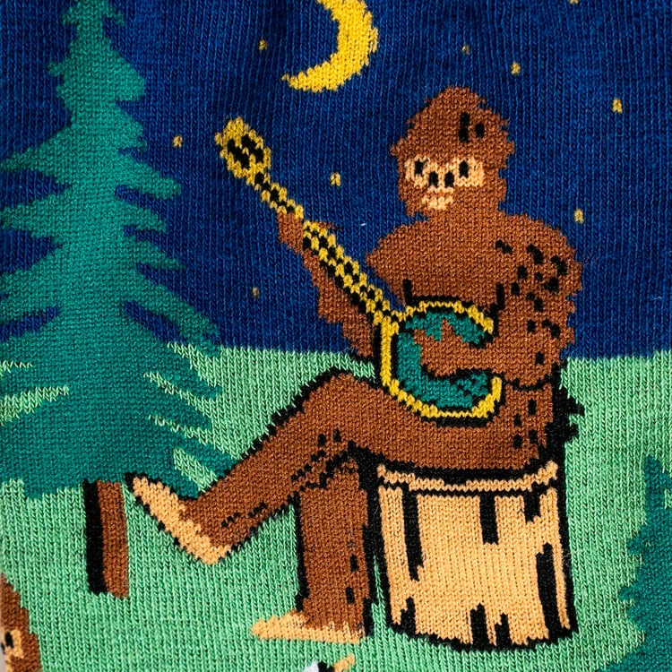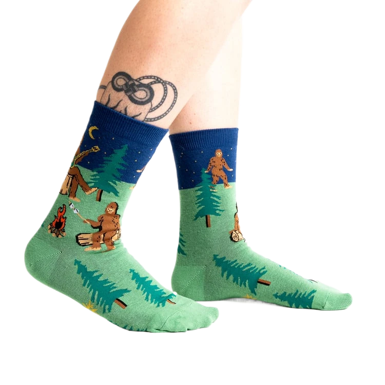 Theres no mystery hereBigfoot has been spotted, and he’s camping right on your socks! Our Camping Sasquatch socks bring the thrill of adventure and the legend of the elusive forest dweller to your feet. Perfect for those who love the great outdoors, these socks feature a playful pattern of Bigfoot, a campfire, a forest, and a moon, all set against a vibrant green backdrop with striking blue cuffs. Whether you’re a believer or just a fan of fun designs, these socks are a must-have for your next adventure.