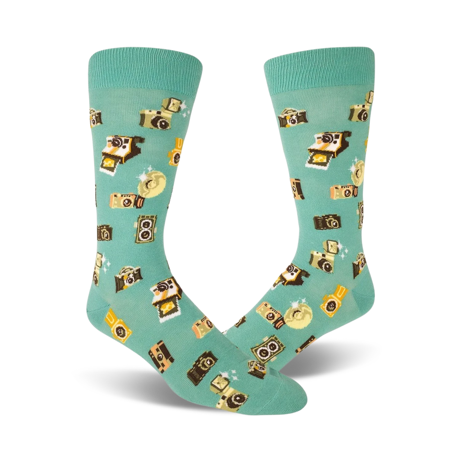 Say Cheese! Let the vintage cameras on these mint green socks transport you to simpler times and create a vibrant backdrop for you to live out your dreams. These crew socks (made for men) are perfect for any photography enthusiast looking to spruce up their sock drawer. Remember, you don’t have to be a pro to appreciate the art of a good photo; put your best foot forward with our Say Cheese socks.