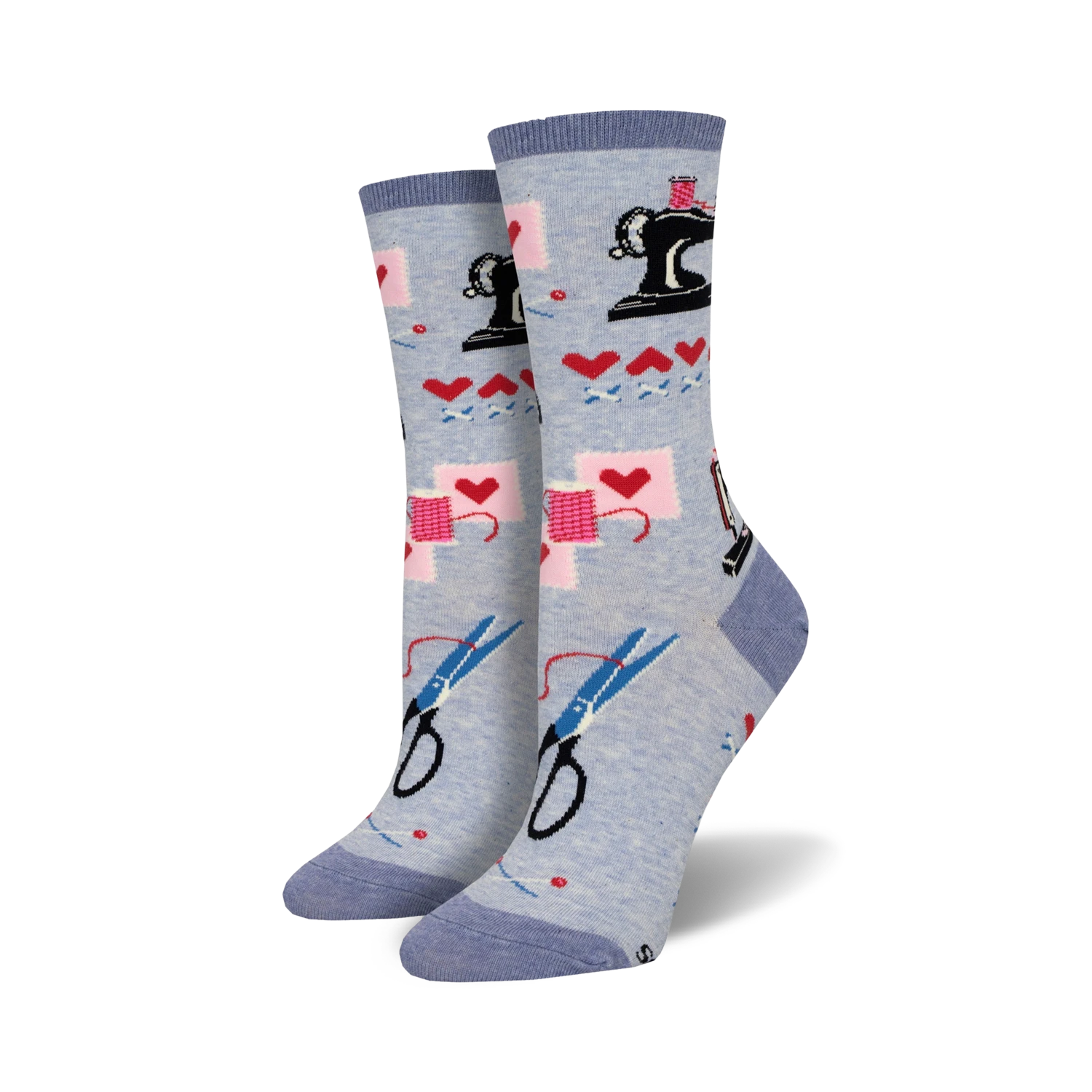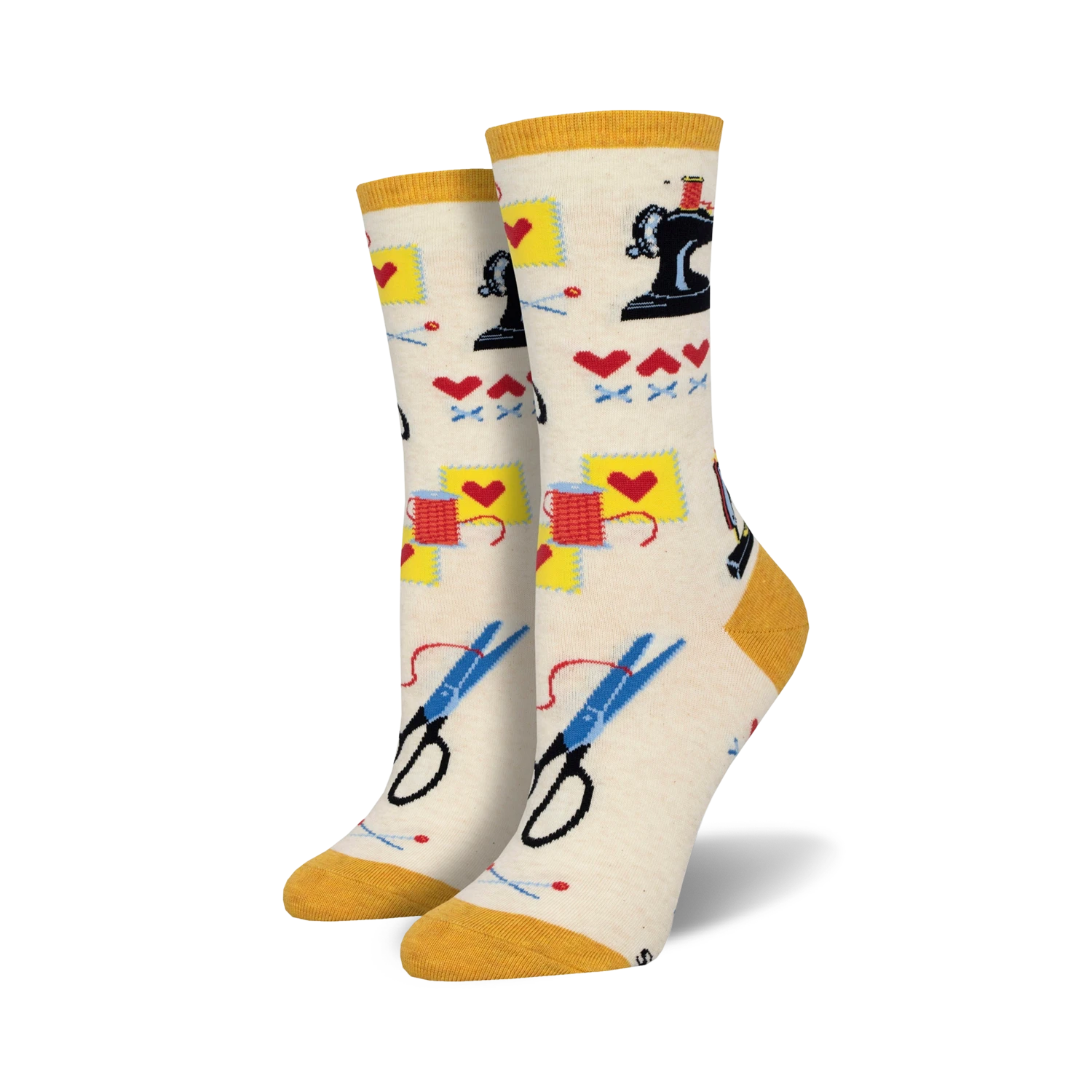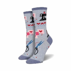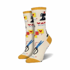 Sew In Love Novelty Socks: Fall head over heels for our Sew In Love socks! These off-white crew socks feature a colorful pattern of scissors, thread, sewing machines, and hearts, making them a fun and stylish choice for any sewing enthusiast. Show off your passion for stitching with these cozy companions designed to bring a smile to your face. From beginner sewers to fashionistas, these socks will keep your feet comfortable and your style on point!