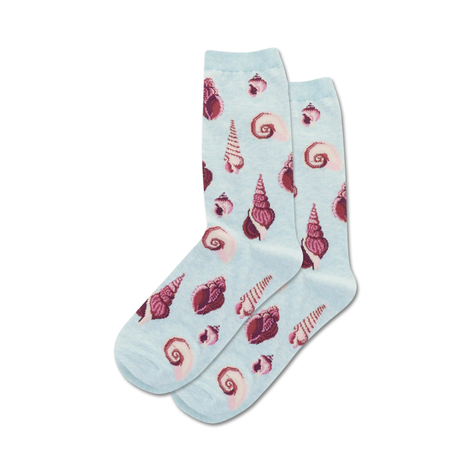 Shells: Strut Your Seashells in Style! Dive into a sea of style with our “Shells” crew socks designed for the modern mermaid. Picture this: light blue socks adorned with a mesmerizing pattern of seashells in muted shades of pink, whispering tales of sun-kissed beaches and salty breezes. Wear these socks and let your feet become part of the beachy narrative. Fun fact: Did you know that seashells are remnants of marine life that once called our oceans home? Grab a pair and let your feet be a testament to the beauty and diversity of our underwater world.