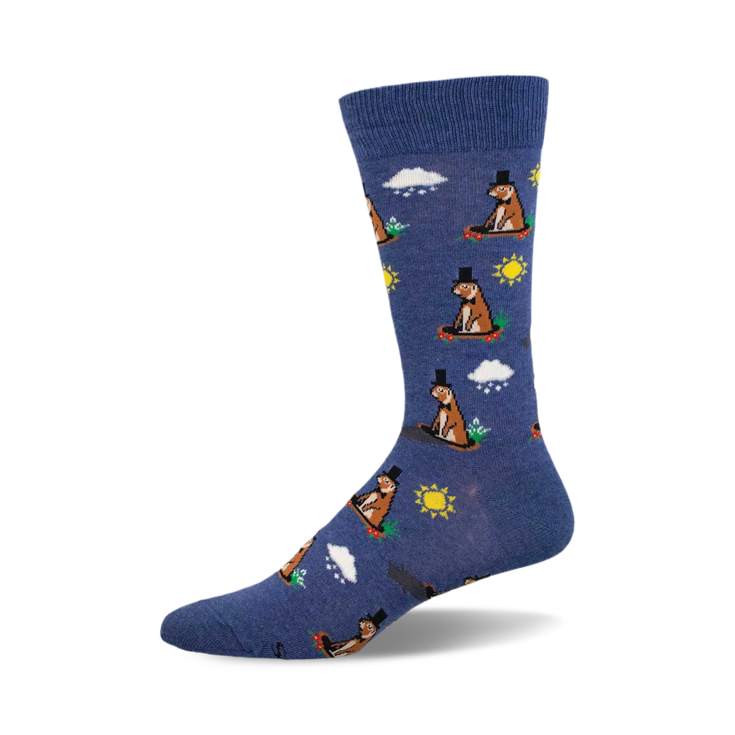 Grab your top hat—it’s time to embrace the quirkiest weather tradition around! “Six More Weeks” socks feature groundhogs dressed to the nines, basking in sunny skies and hiding beneath cloudy ones. Perfect for weather watchers and anyone who loves a touch of whimsy, these socks will keep your feet forecasting fun all year long.
