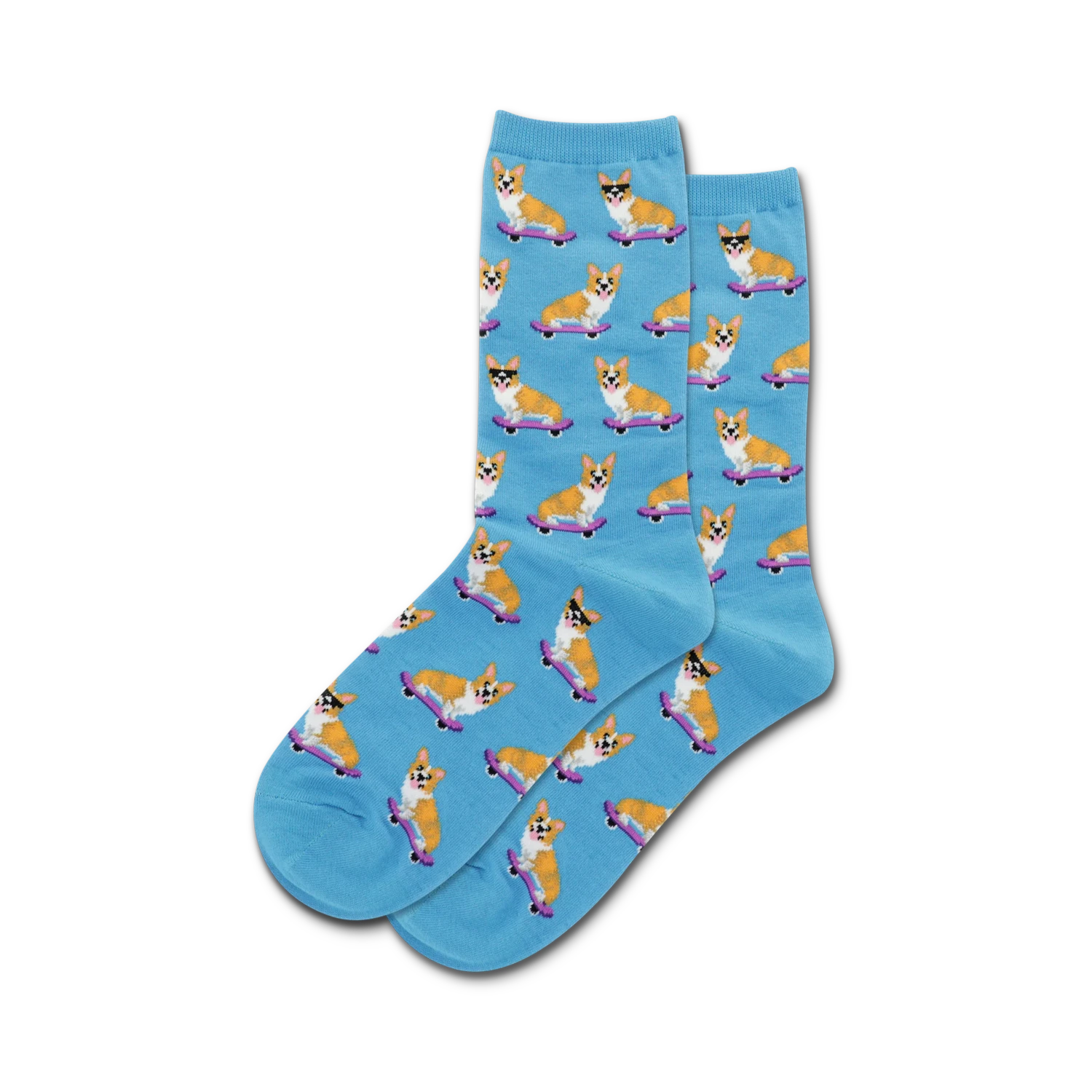 Get ready to roll with our Skateboarding Corgi Socks! These funky blue crew socks are a must-have for corgi lovers. Watch as fearless corgis shred on neon purple skateboards while sporting vintage shades. It’s the perfect blend of doggy daring and retro coolness. Slip into these socks, and let your feet ride the wave of fun and vibrant style. Get your paws on these corgi-tastic socks today!
