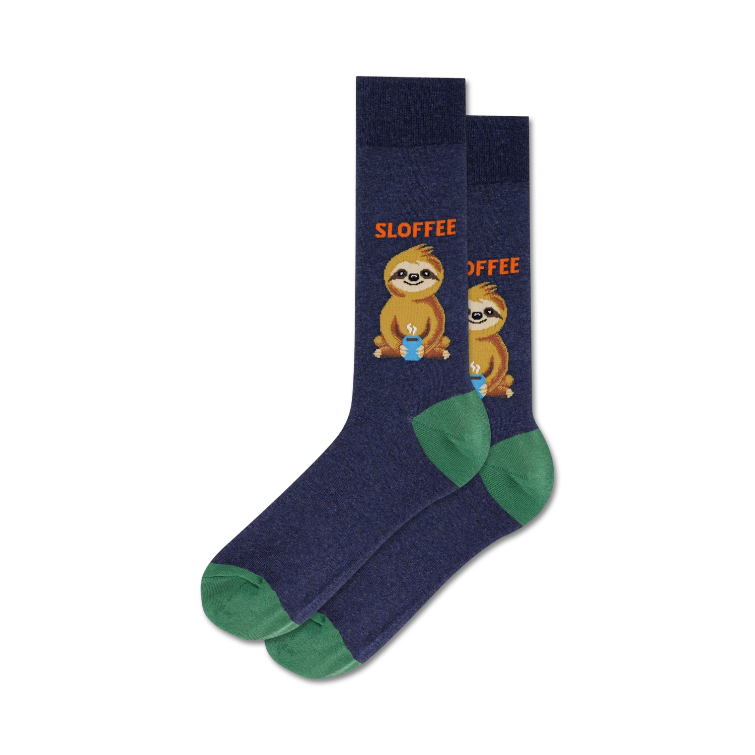 Sloffee Socks: The Sloth-iest Socks You’ll Ever Wear! Sloth around in style with these Sloffee socks, featuring a delightful pattern of sloths sipping coffee from red mugs. Show off your caffeine-fueled sloth spirit with these comfy, black crew socks with a touch of gray on the heel and toe. These Sloffee socks are perfect for men who love sloths, coffee, or just plain lounging around. Embrace the slow life with a pair of Sloffee socks today!