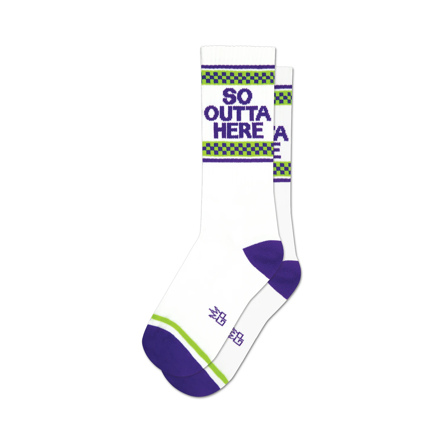 Escape the mundane on the express lane of style with our FINISH LINE collection! These checkered striped socks are your secret weapon against the dull drudgery of everyday footwear. Decked out in white with a splash of green checks crowning the top, they’re a clear signal you’re miles ahead in the fashion race. And with “so outta here” scripted in playful purple, your feet aren’t just walking—they’re making a statement.