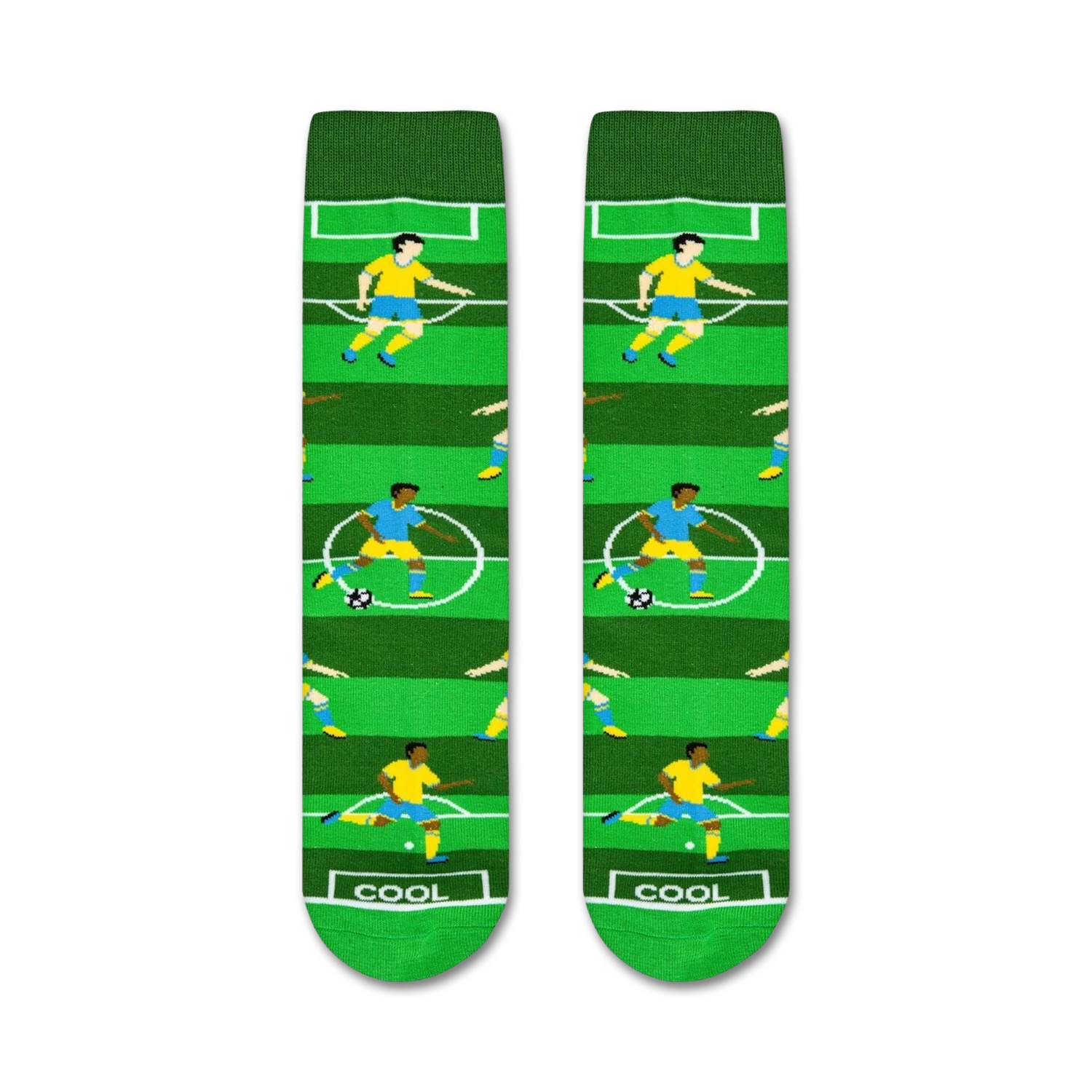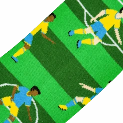 Kick off your style game with these Soccer socks! Featuring an energetic pattern of soccer players in blue and yellow uniforms battling it out on a field, these socks will make you the MVP of sock swag. Whether you’re a footy fan or just love fun socks, these crew socks are sure to score a goal in your sock drawer. So lace up your sneakers, slide on these socks, and get ready to take your feet on a wild soccer adventure!