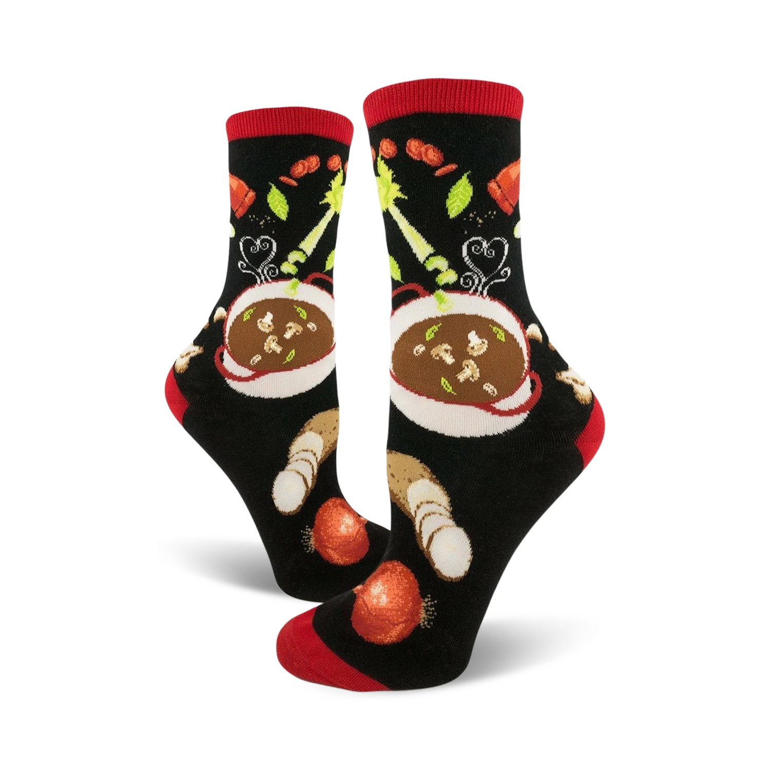 Calling all soup lovers and fashionistas: get ready to dive into a bowl of style with our “Soup’s On” novelty socks! Picture this: a vibrant pattern of steaming red and white soup bowls with black handles, swimming in a sea of black. And wait, what’s that? Carrots, celery, and mushrooms floating around, adding a dash of whimsy to your feet. These crew-length socks, designed for women with a passion for food and fun, are the perfect way to liven up any outfit. Pull on a pair and let the compliments pour in like a hot bowl of soup on a cold day!