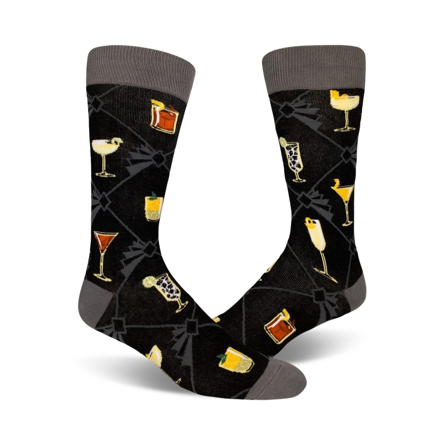 Speakeasy Cocktails socks: Like a sip of your favorite mixed drink, these black crew socks feature cartoon-like cocktails that will get you through the day. Pop on a pair of these classic Speakeasy Cocktails socks and let the good times pour!