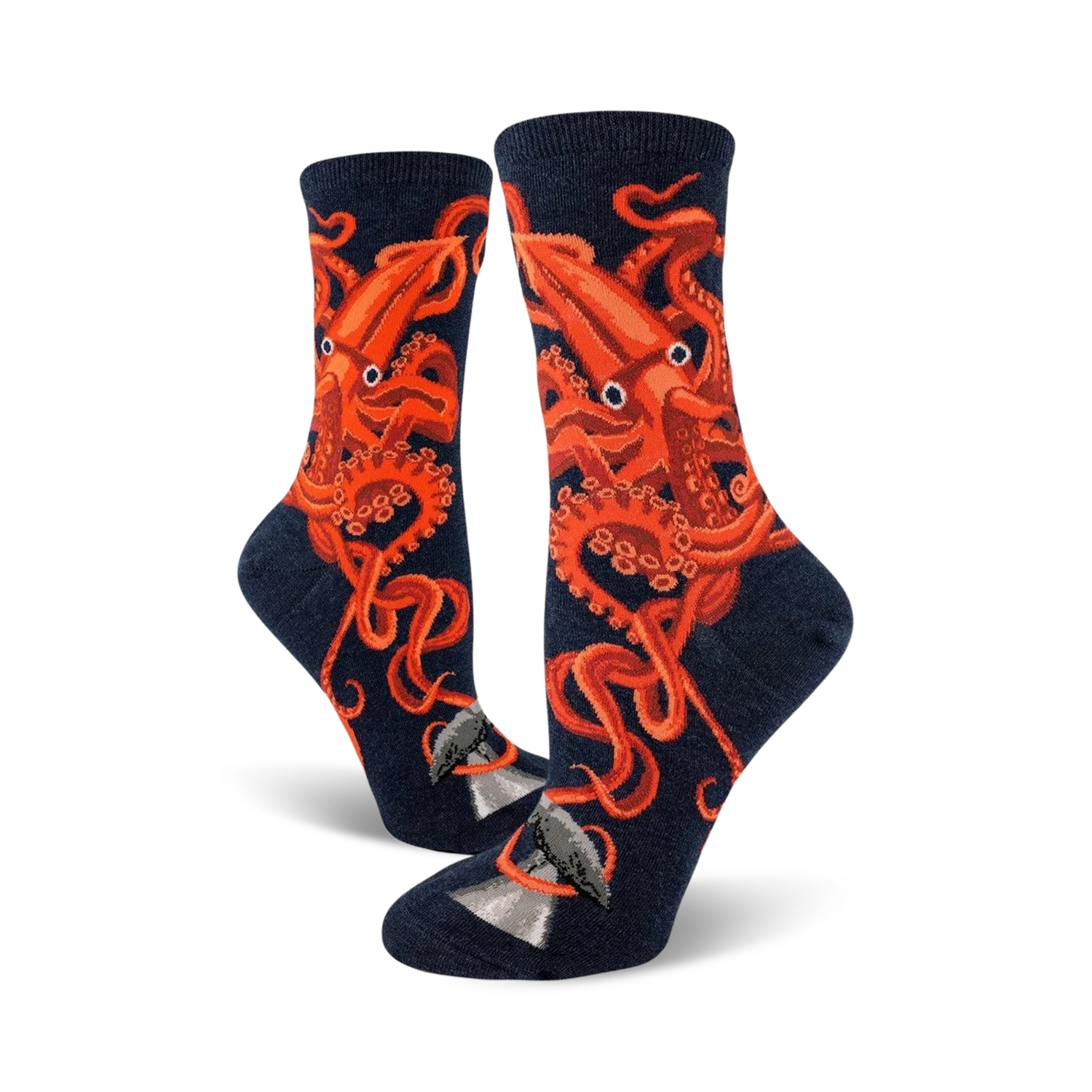 Plunge into oceanic adventures with these “Squid & Whale” women’s crew socks! Adorned with a vibrant orange octopus entangling a mighty sperm whale on a deep blue backdrop, these socks bring the thrills of the sea right to your feet. Perfect for ocean enthusiasts or anyone looking to add a splash of marine flair to their wardrobe, these socks will keep your feet snug and stylish. Flaunt your sea spirit and stay cozy all day long!