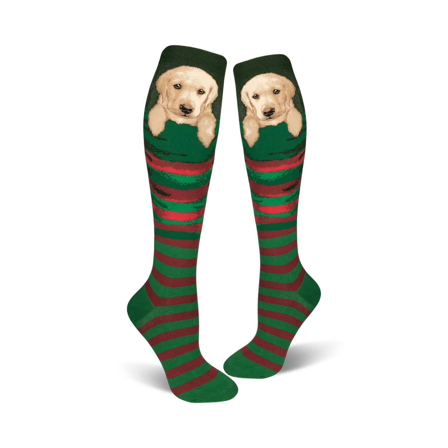Unleash your holiday spirit with these Knee High Stocking Pupper socks! Picture this: a golden retriever puppy peeking out of a pocket on a festive green background with bold red stripes. You’ll be sleighing it with style and spreading Christmas cheer wherever you go!
