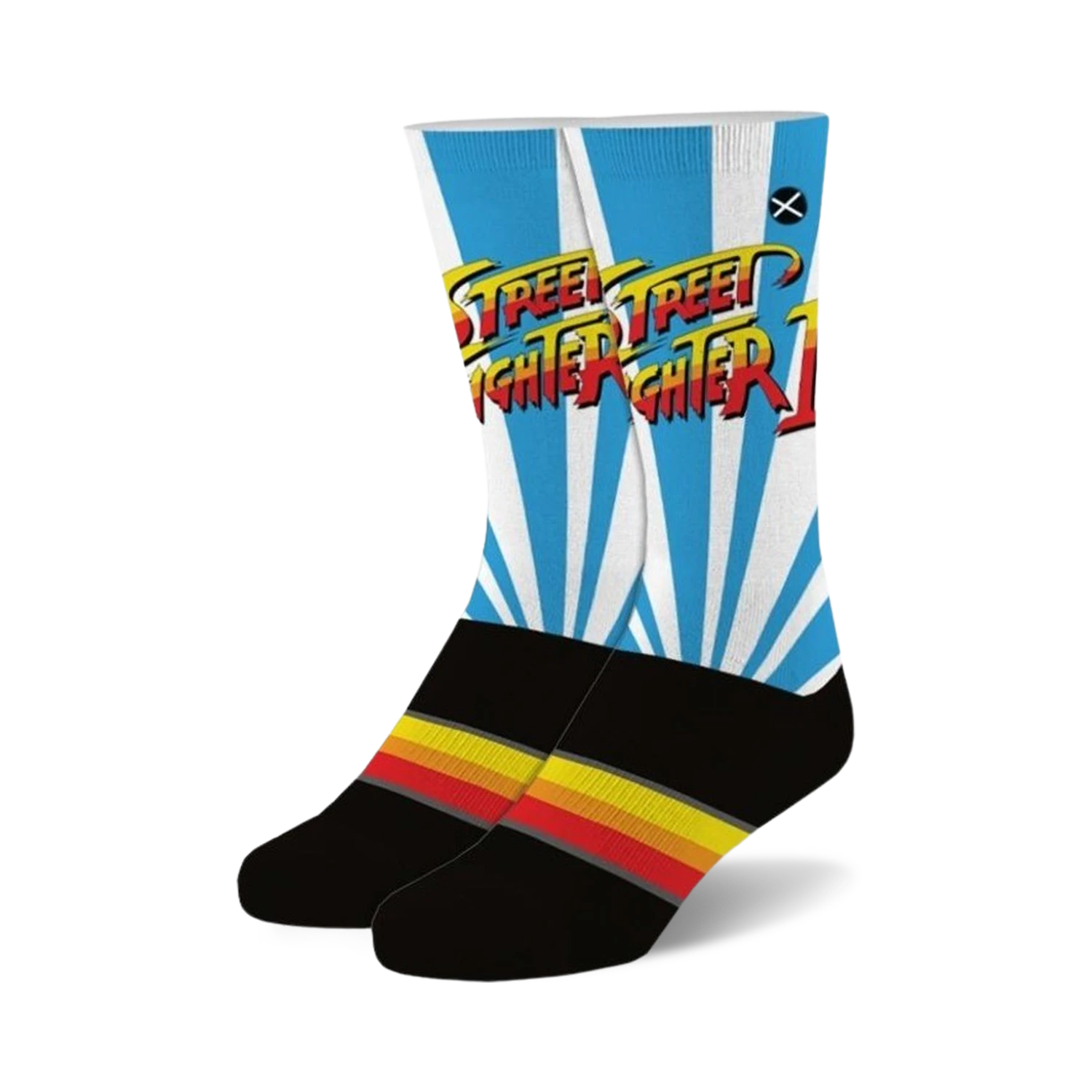 In a world where Ken’s legendary blue and black Street Fighter logo can end up on your feet, you’re always ready to tussle. Street Fighter 2 logo novelty crew cut cotton poly crew cut athletic sports crew sock. Take on the world or just take on the day like a Street Fighter legend with these vibrant novelty dress athletic comfort crew cut Street Fighter logo comfy crew cut cotton poly crew sock.