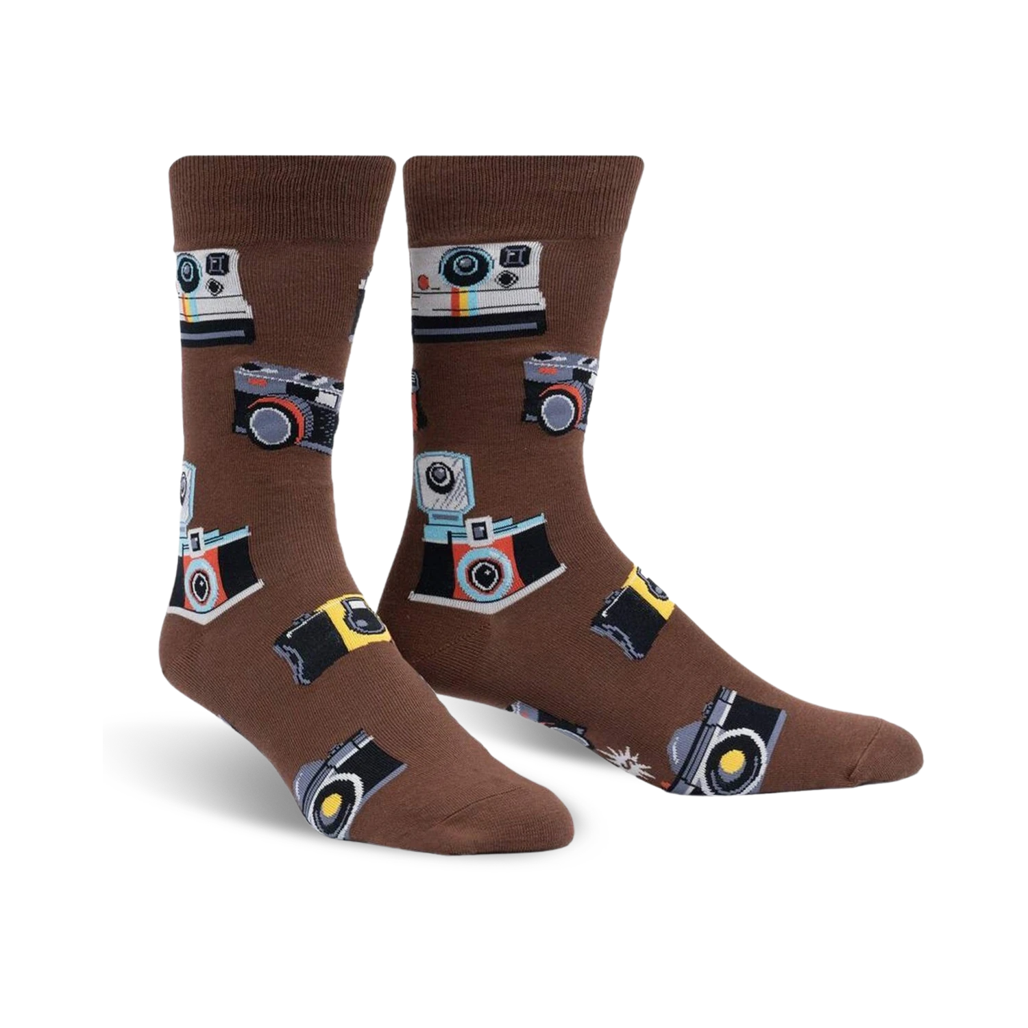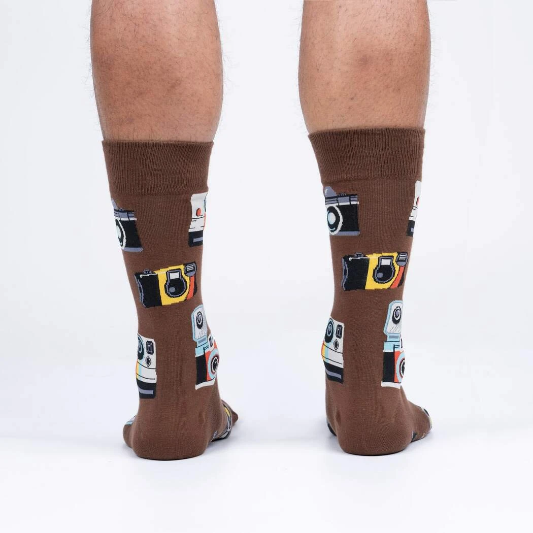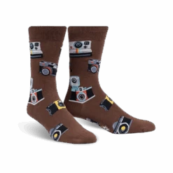 Strike a Pose with Style! These vintage camera-printed crew socks are sure to turn you into the star of the show. With their brown background and vibrant pattern of classic cameras, these socks will make you the center of attention wherever you go.
