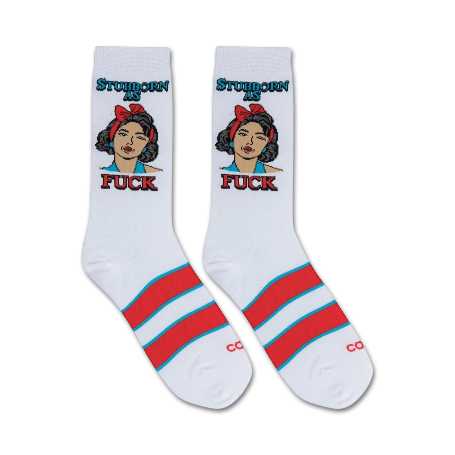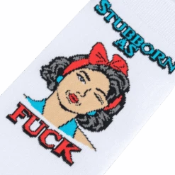 Stubborn women rule the world. Show off your unwavering stubbornness with these “Stubborn AF” socks with a fun repeating pattern of a headstrong, red headband-wearing woman winking at you. The word “fuck” is boldly written below her in black letters. The crew socks have red and white striped cuffs. Strut around and remind everyone that sometimes being stubborn is the best policy.