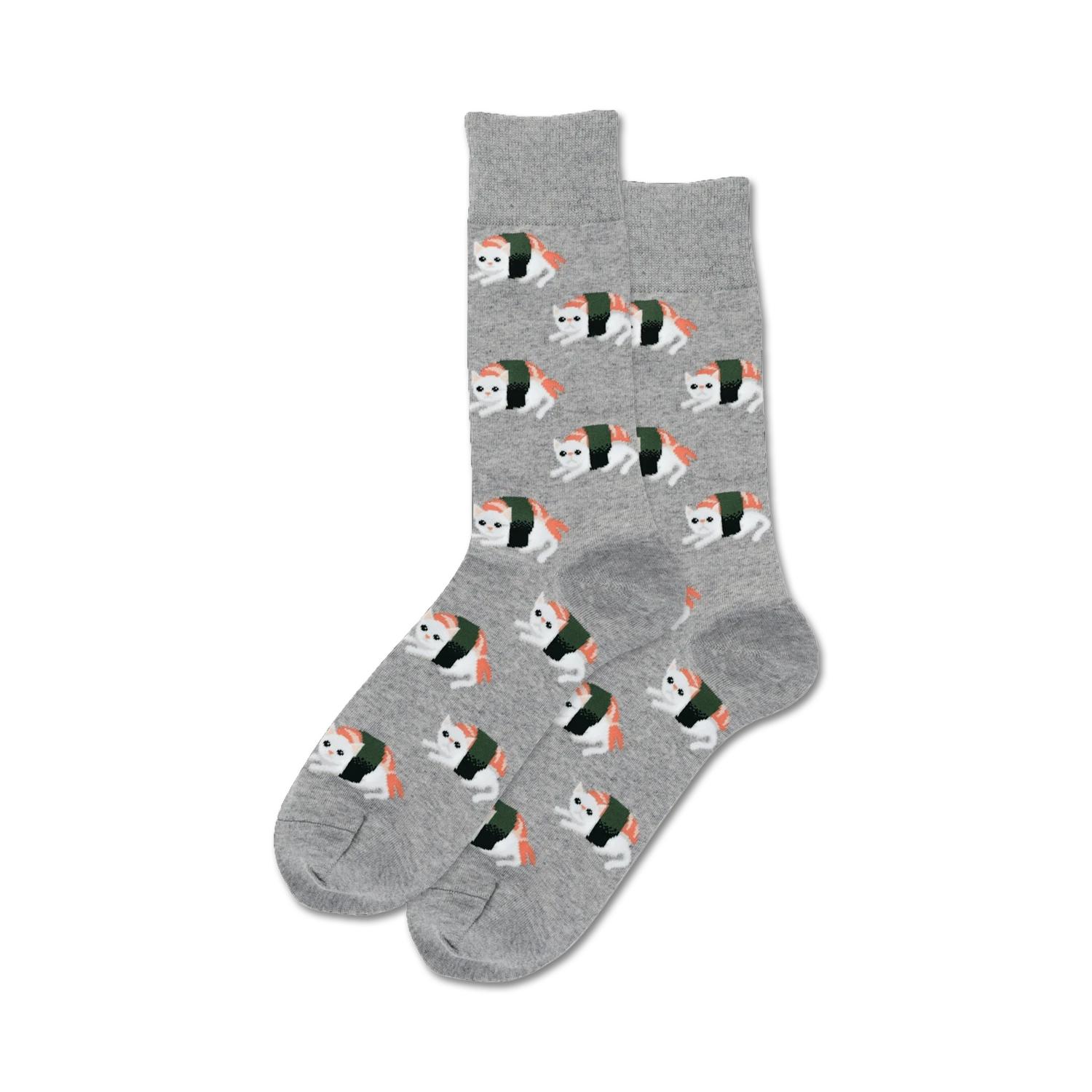 Don’t be a sour puss, slip into these Sushi Cat socks! Dishing out style with every step, these socks are sure to tickle your fancy. With their gray base and cartoon cats carrying sushi on their backs, these socks are the purrfect way to add a bit of fun and whimsy to your everyday attire.
