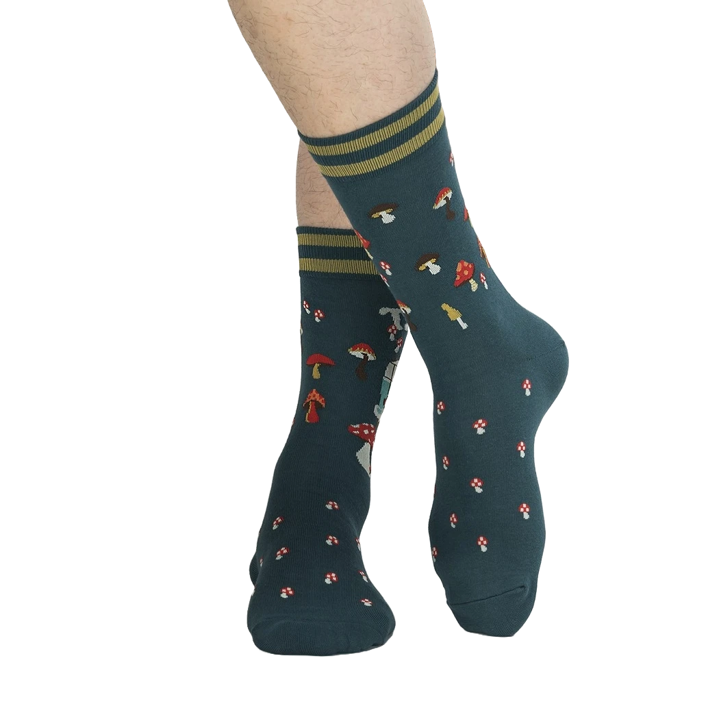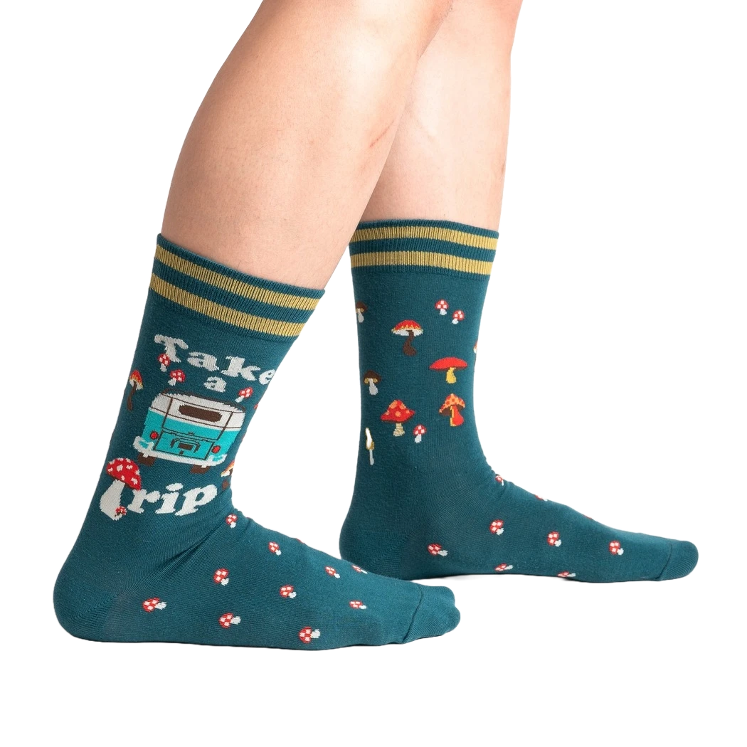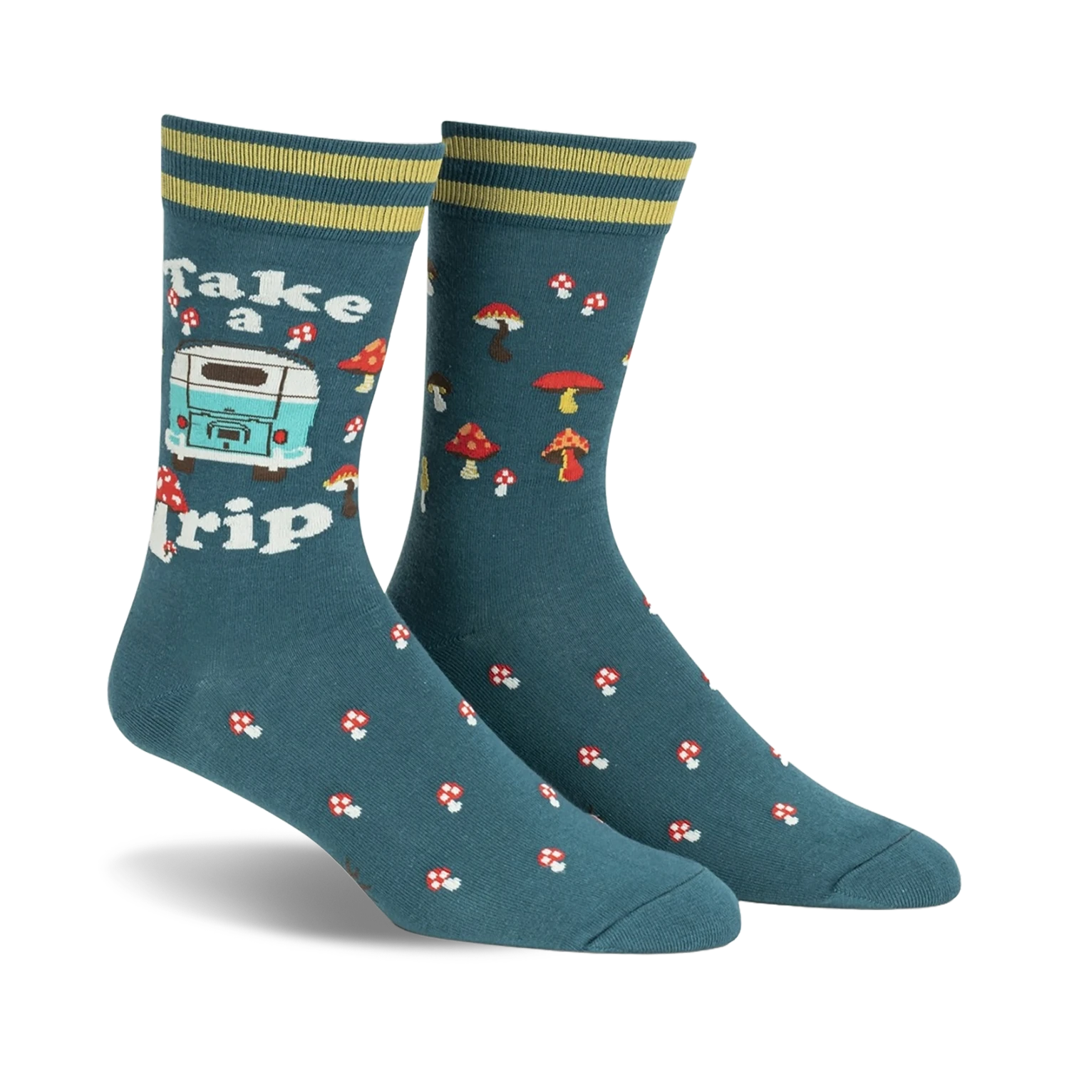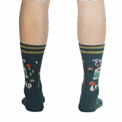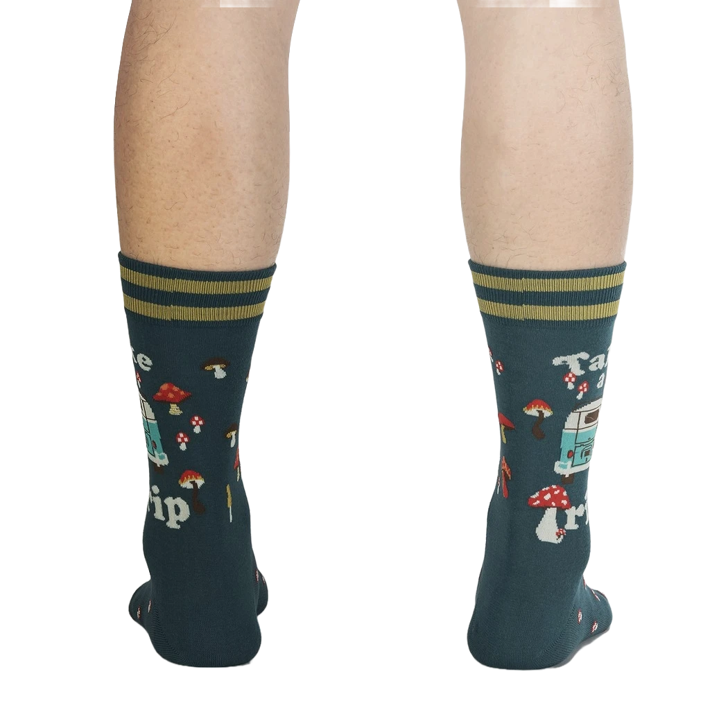 Get ready for an adventure with these funky camping socks! Featuring a dark teal background with red and white mushrooms, a light blue van with the words “Take A Trip,” these men’s crew socks are sure to tickle your fancy. Whether you’re hitting the trails or just chilling at home, these socks will bring a smile to your face and keep your feet cozy. Made for those with a love for the outdoors and a sense of humor, these socks are perfect for adding some fun to your sock drawer.