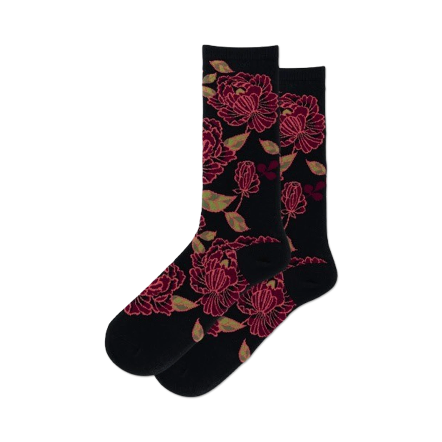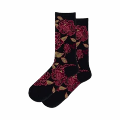 Enter the Tapestry Floral Sock, a botanical dream garden blooming on your feet! With crimson red roses, fuchsia pink camellias, and emerald green leaves dancing across a black background, these crew socks are a vibrant burst of beauty. Step into a world of color and let your toes bask in the glory of these exquisite blooms.