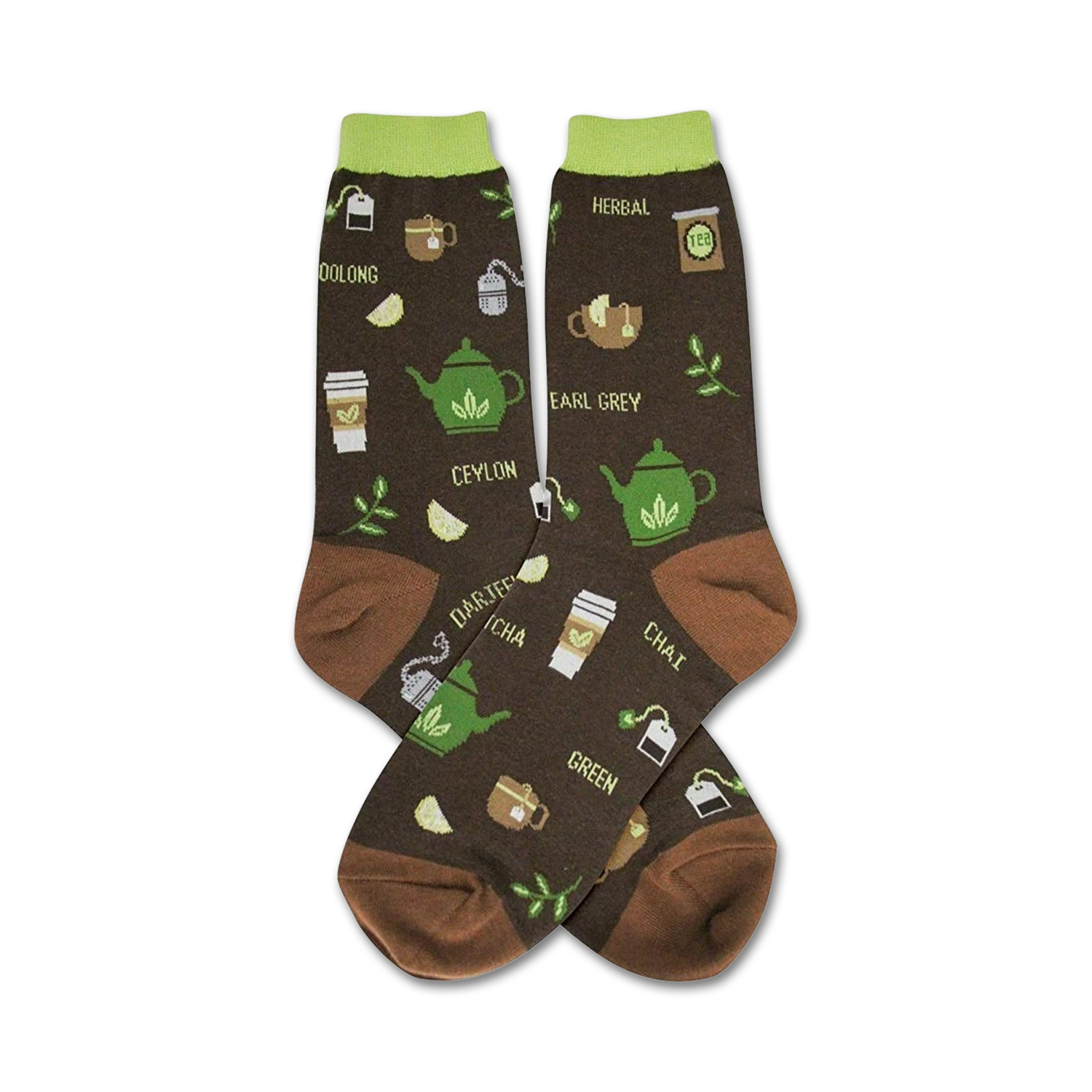 Tea-riffic socks for tea lovers! Step into a cup of fashion with our brown crew socks featuring a delightful pattern of tea leaves, tea bags, and tea pots. Sip on style with oolong, herbal, earl grey, ceylon, darjeeling, chai, and green tea designs. Show off your love for tea and add a touch of fun to your everyday style.