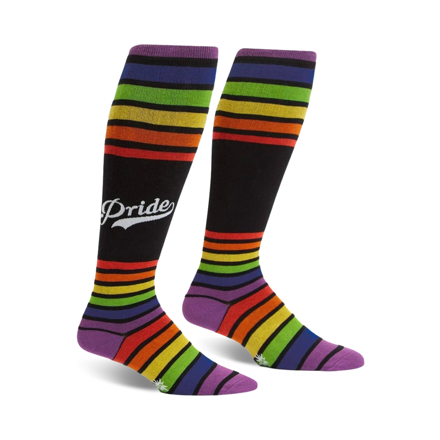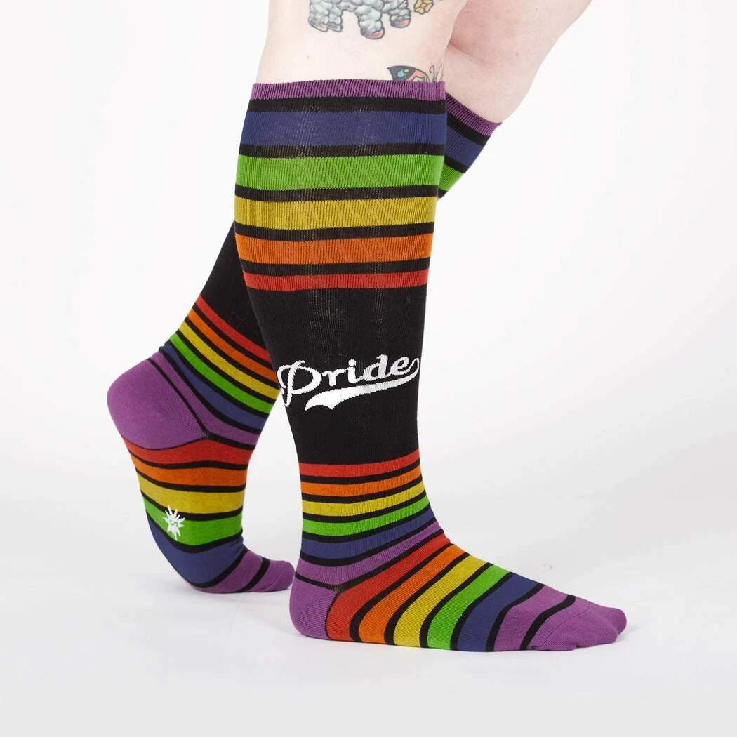 Team Pride Stripe Socks: These knee-high socks, designed to fit a wide calf, are as bold as they are vibrant with horizontal rainbow stripes. From the boardroom to the dance party, show your true colors in these socks made for men and women. Show your pride with a pair of these electric socks!