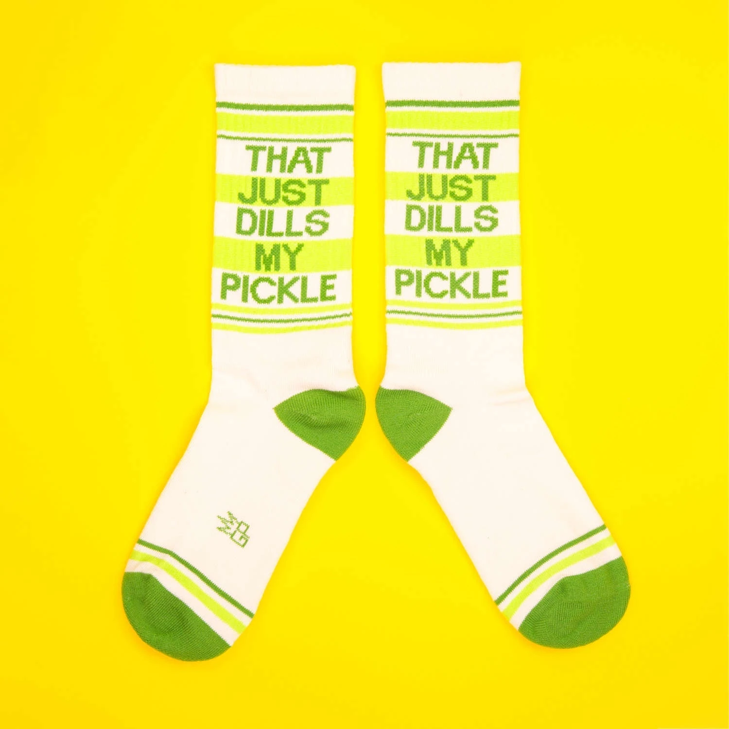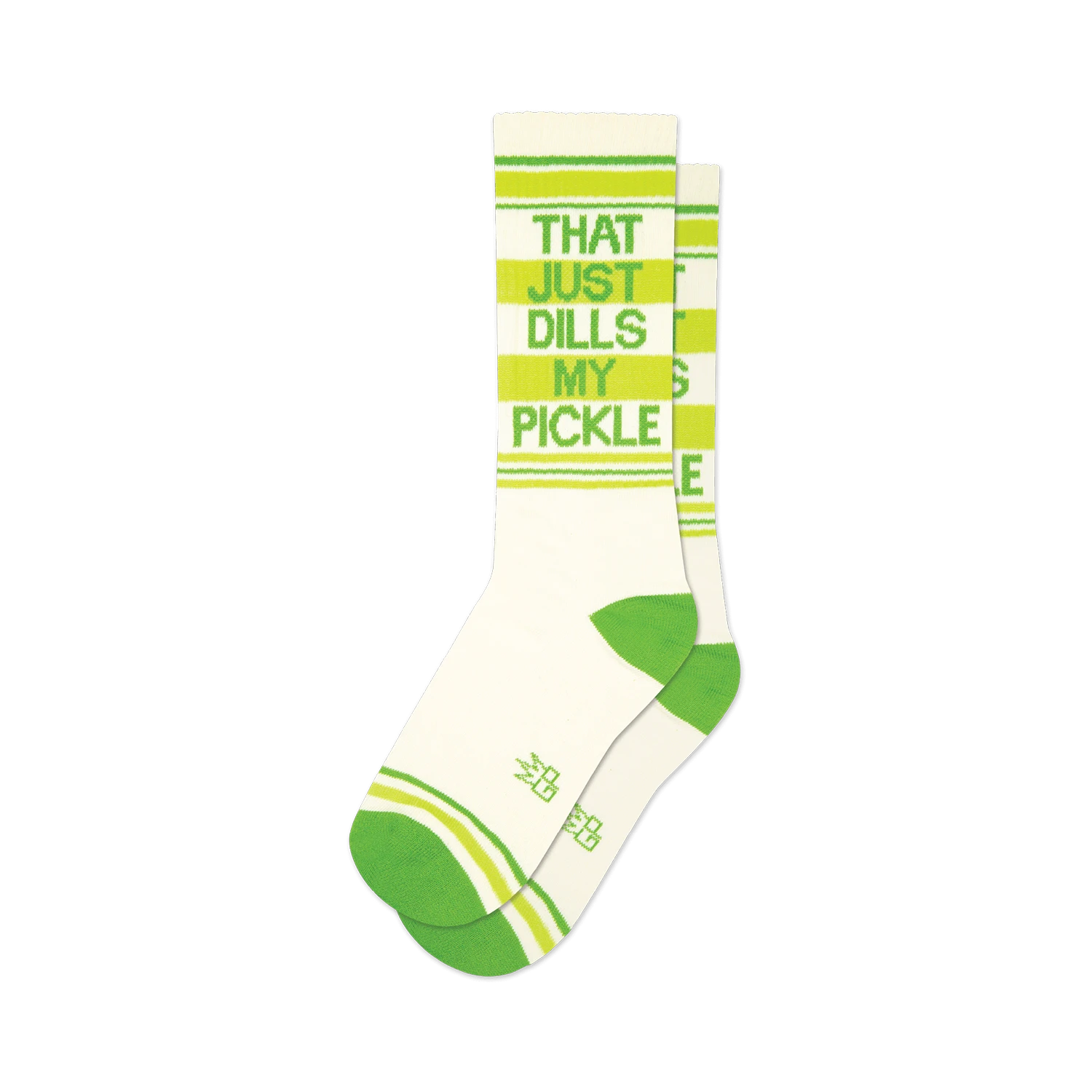 Ever notice how the perfect pickle can elevate a sandwich to legendary status? These socks capture that same spirit of satisfaction and sprinkle it with a dash of sass. With crisp colors and a playful nod to all things briny, “That Just Dills My Pickle” socks bring comfort and a chuckle to your day. Made in the USA, these unisex gym socks are crafted from Natural Cotton with Deere Green and Lime Nylon accents.