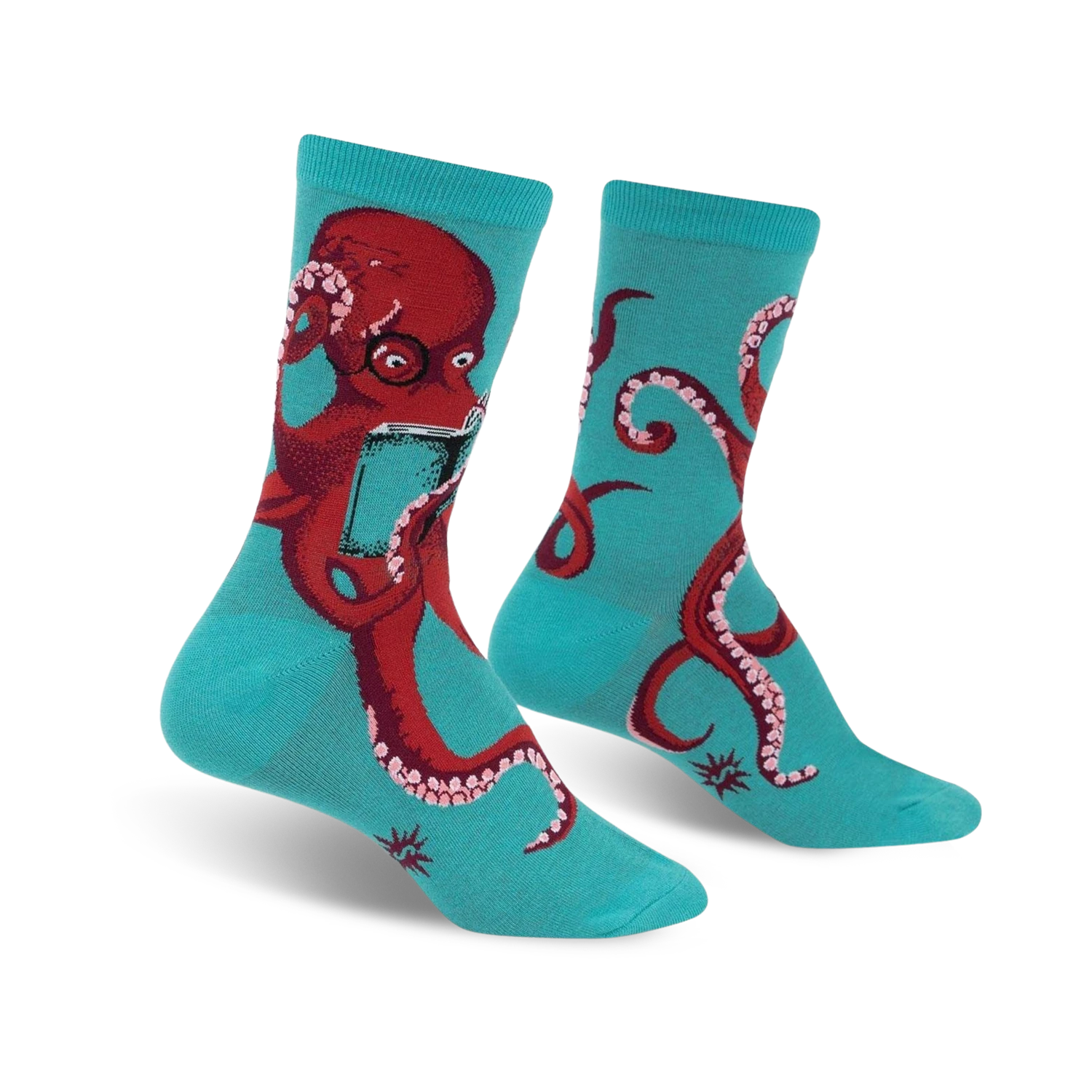 Octopuses got brains the size of peanuts but they’re one of the most intelligent animals on earth. They love reading too. So, when your book club meets, read The Octive Reader. These turquoise socks feature bright red octopuses wearing glasses and reading books. They’re made for women and come in crew length. You’ll love them almost as much as octopuses love books!