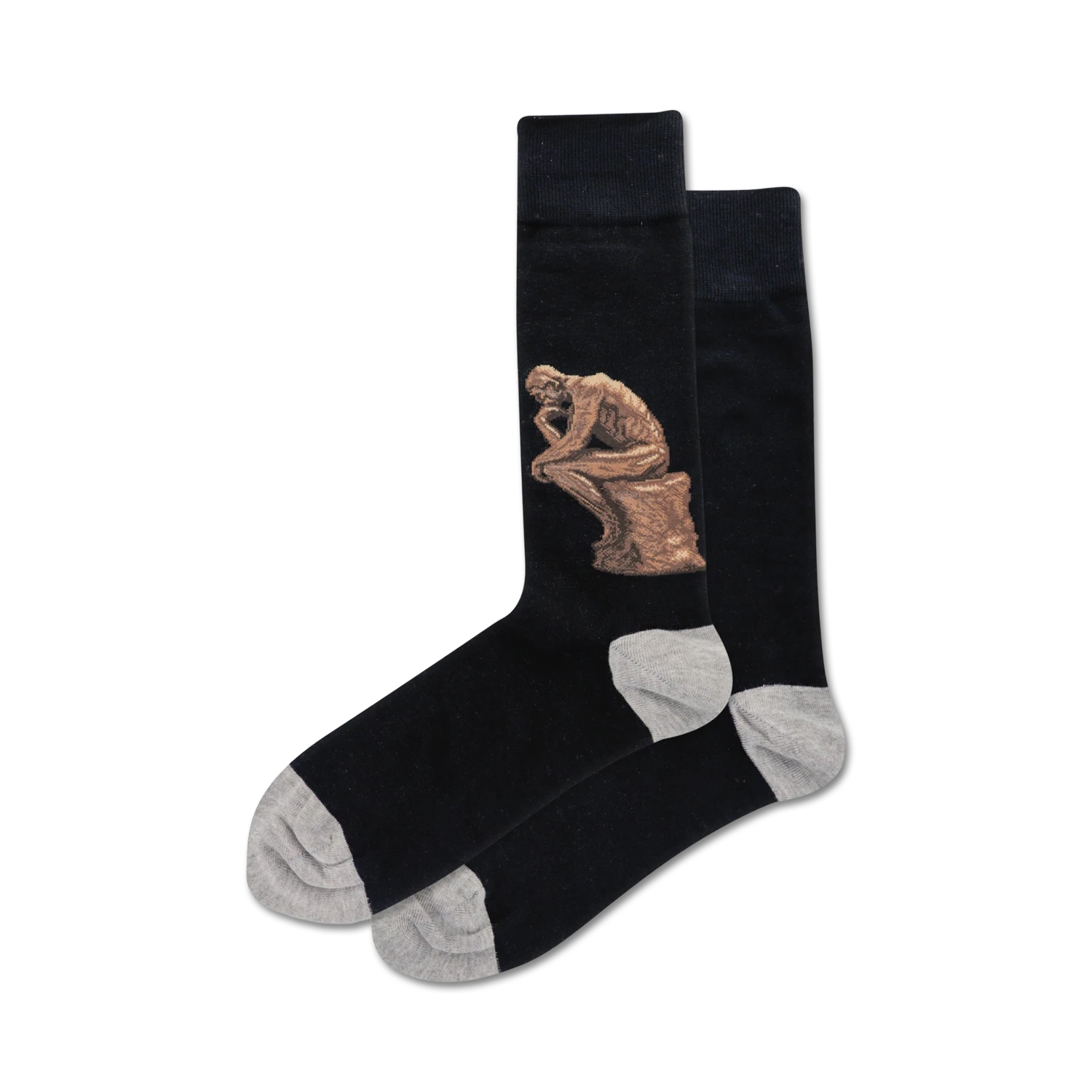 Go deep with The Thinker socks, featuring a profound pattern of Auguste Rodin’s iconic sculpture. Whether pondering life’s mysteries or just looking contemplative in your loafers, you’ll feel smart and a tad bit artistic in these thinker socks.