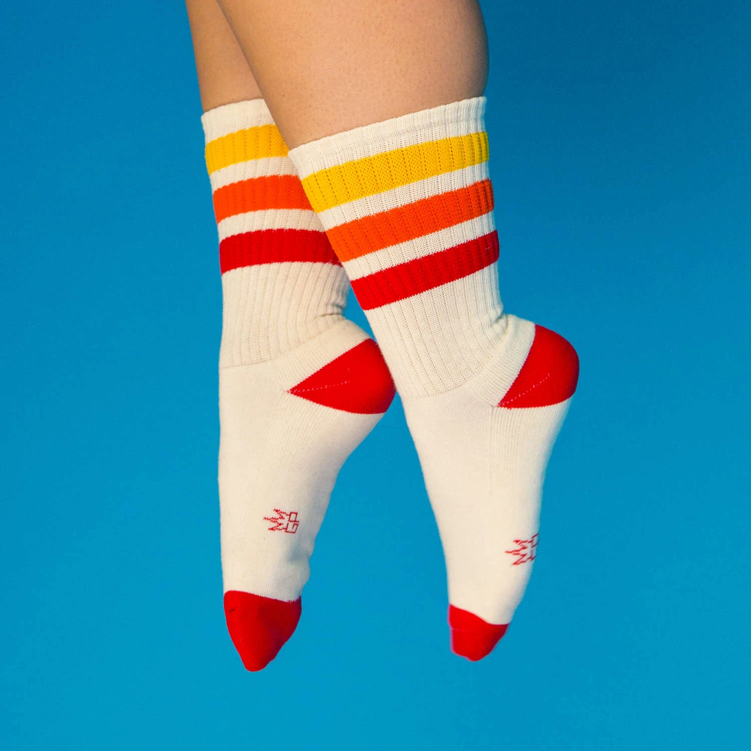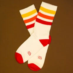 Unleash your inner tiger with a splash of vibrant colors reminiscent of a retro gym class where style and comfort never skipped a beat. These socks are a cozy embrace for your calves, whether you’re channeling your wild side or just lounging around. Made in the USA with a blend of Natural 1/18 Cotton and a trifecta of Red, Orange, and Gold Nylon, these gender-neutral wonders are designed to fit most, making them the ultimate companion for any adventure or lazy day.