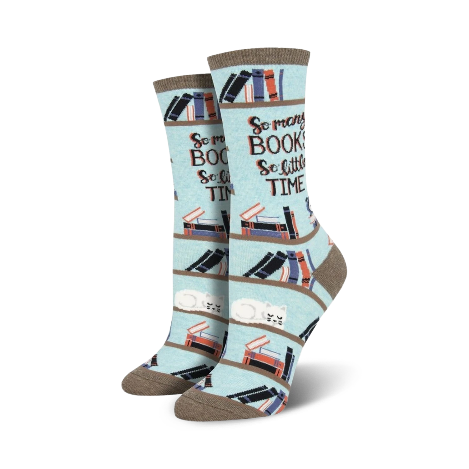 Time For A Good Book socks: Show off your introverted, bookworm side with these knee-high socks showcasing brown bookshelves and sleeping cats. Dive into a new adventure with these comfy socks that are perfect for both book club and cat naps. Purrfect for any literary feline fan!