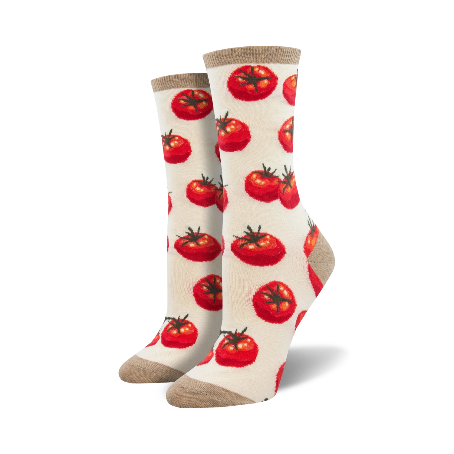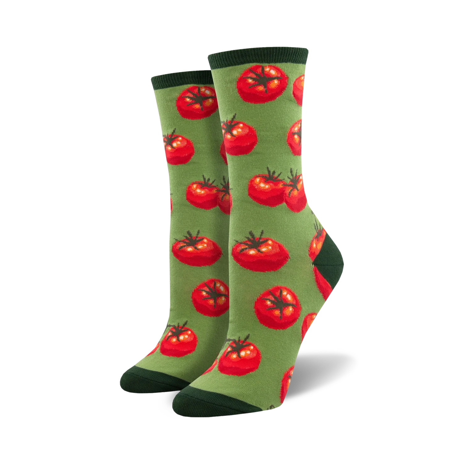 Looking for a fun way to spice up your wardrobe? Toe-May-Toes crew socks are here to help you put the fun in functional! With a bright and colorful pattern of juicy red tomatoes on a green background, these socks are sure to turn heads wherever you go. Whether you’re a gardening enthusiast or just love a good pun, these socks are sure to add a bit of whimsy to your day.
