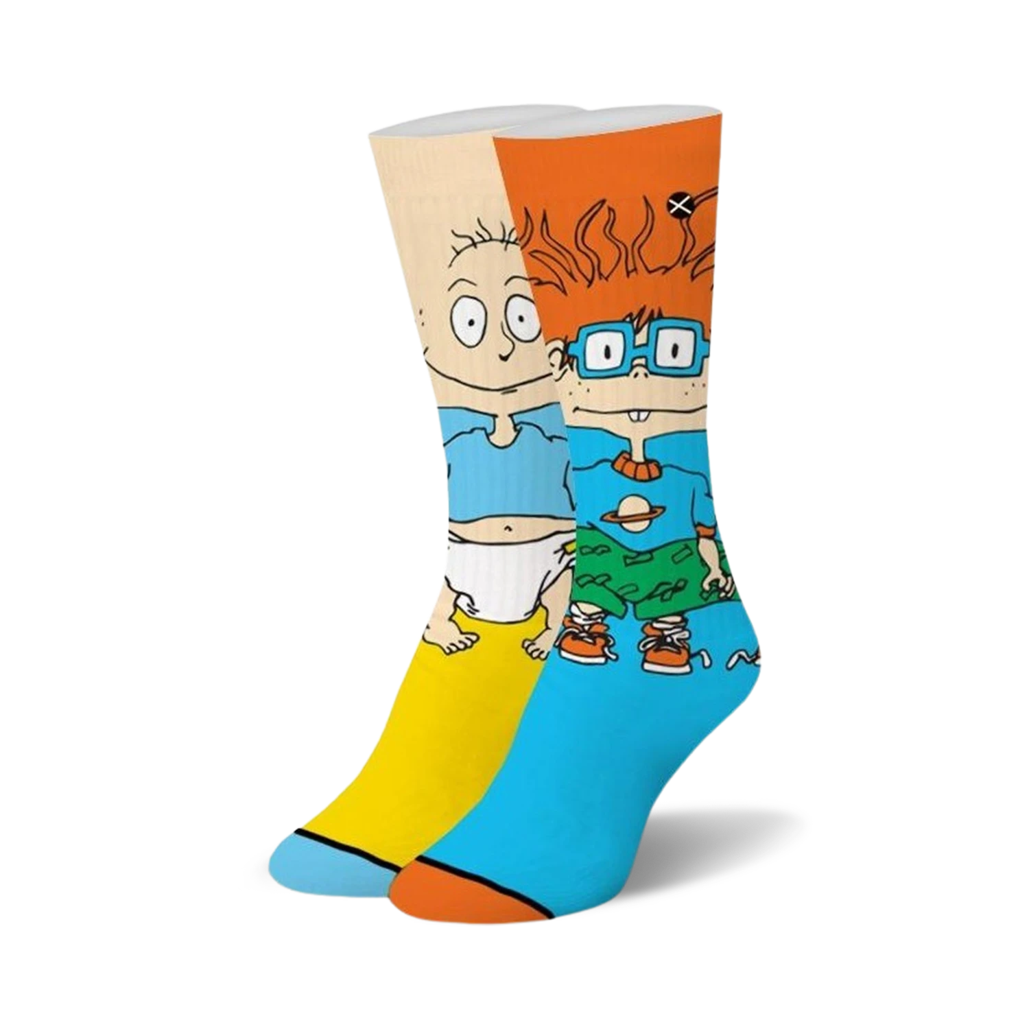 “Add some Rugrats charm to your sock collection with these crew-length beauties! The Tommy and Chuckie 360 Knit Socks feature an adorable allover print of the iconic cartoon duo. Chuckie’s rocking his signature red hair, glasses, and diaper on the right sock, while Tommy brings the giggles with his blonde cowlick and diaper on the left. Get ready to make your feet the stars of the show!”