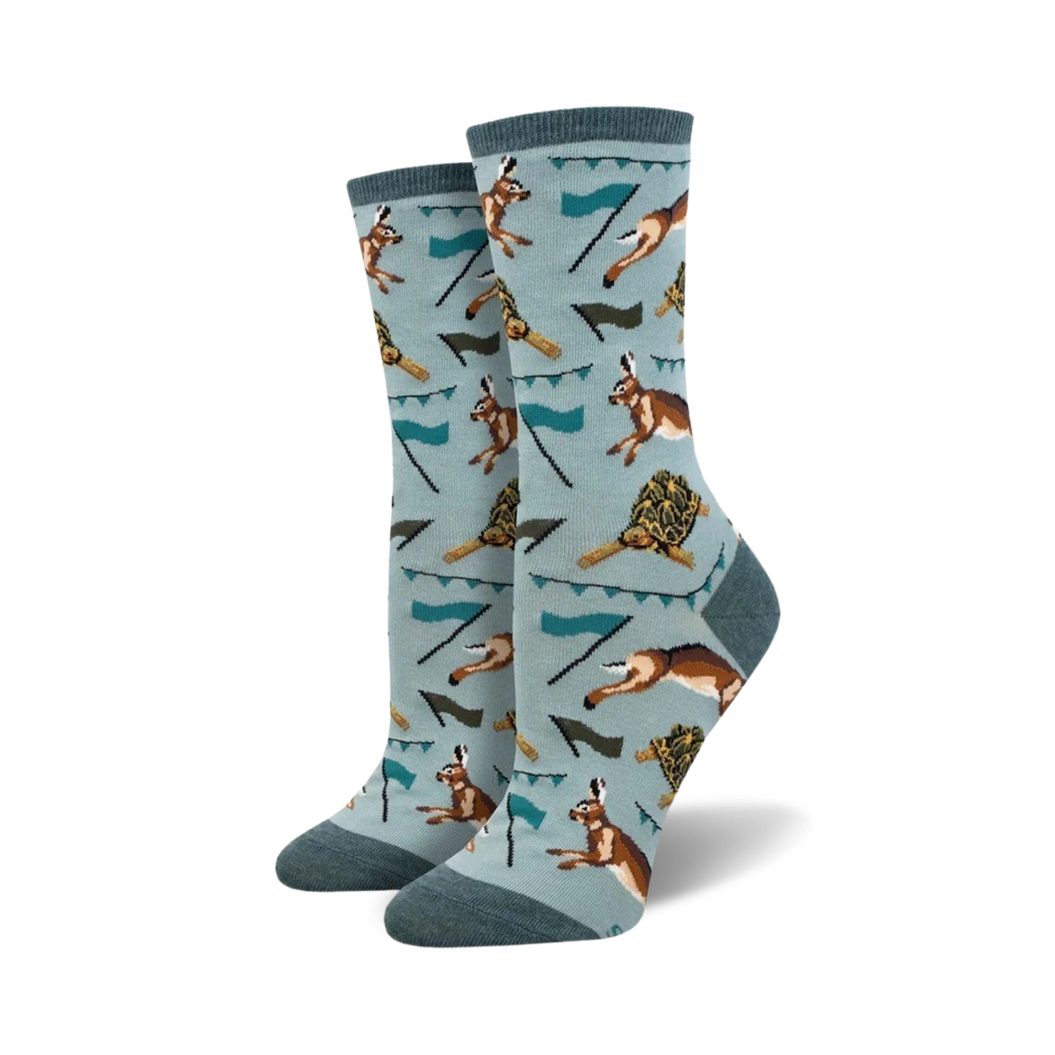 Tortoise And The Hare Womens Crew Socks: These light blue crew socks feature a pattern of happily sprinting tortoises and hares. Rock these comfy socks when you need a reminder that slow and steady wins the race.