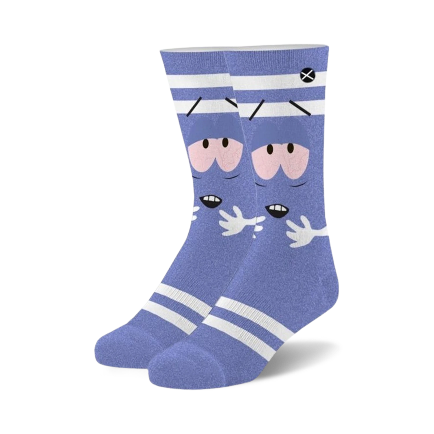 Purple and white socks featuring everyone’s favorite towel-loving blue friend Towelie from South Park. These socks are loud, so get ready to turn heads.
