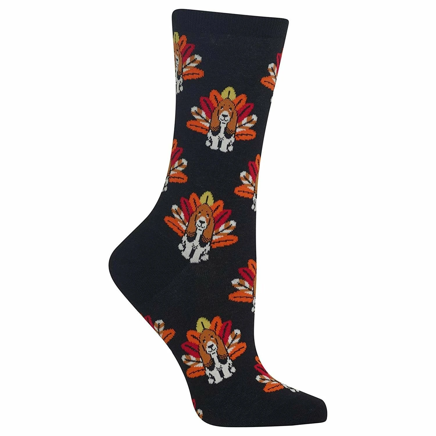 Turkey Dog Socks by Hot Sox are the perfect gift for that socks lover in your life. These thanksgiving themed womens crew socks come in multiple color Options and fit Women’s Shoe Size 4-10.5. Made of 59% Cotton 27% Nylon 12% Polyester 2% Spandex for comfort and durability. A pair of these cool Thanksgiving novelty Socks will certainly give any wardrobe an instant upgrade. Machine wash cold, inside out. Only non-chlorine bleach when needed. Tumble dry low. Do not iron.