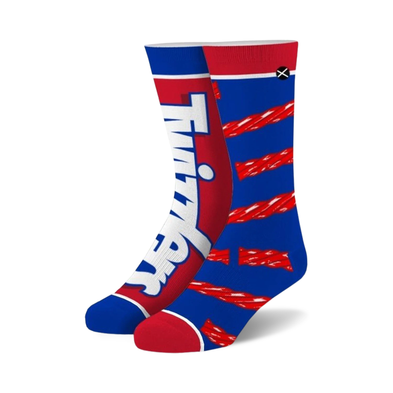 Warning! Twizzlers Split Socks coming through! Perfect for those who want a little bit of sweetness in their lives, these socks feature a white licorice pattern on red and blue fabric. So comfy, they’re like wearing candy on your feet. Whether you’re headed to the office or just lounging around at home, these fun socks will keep your feet looking as good as they feel.