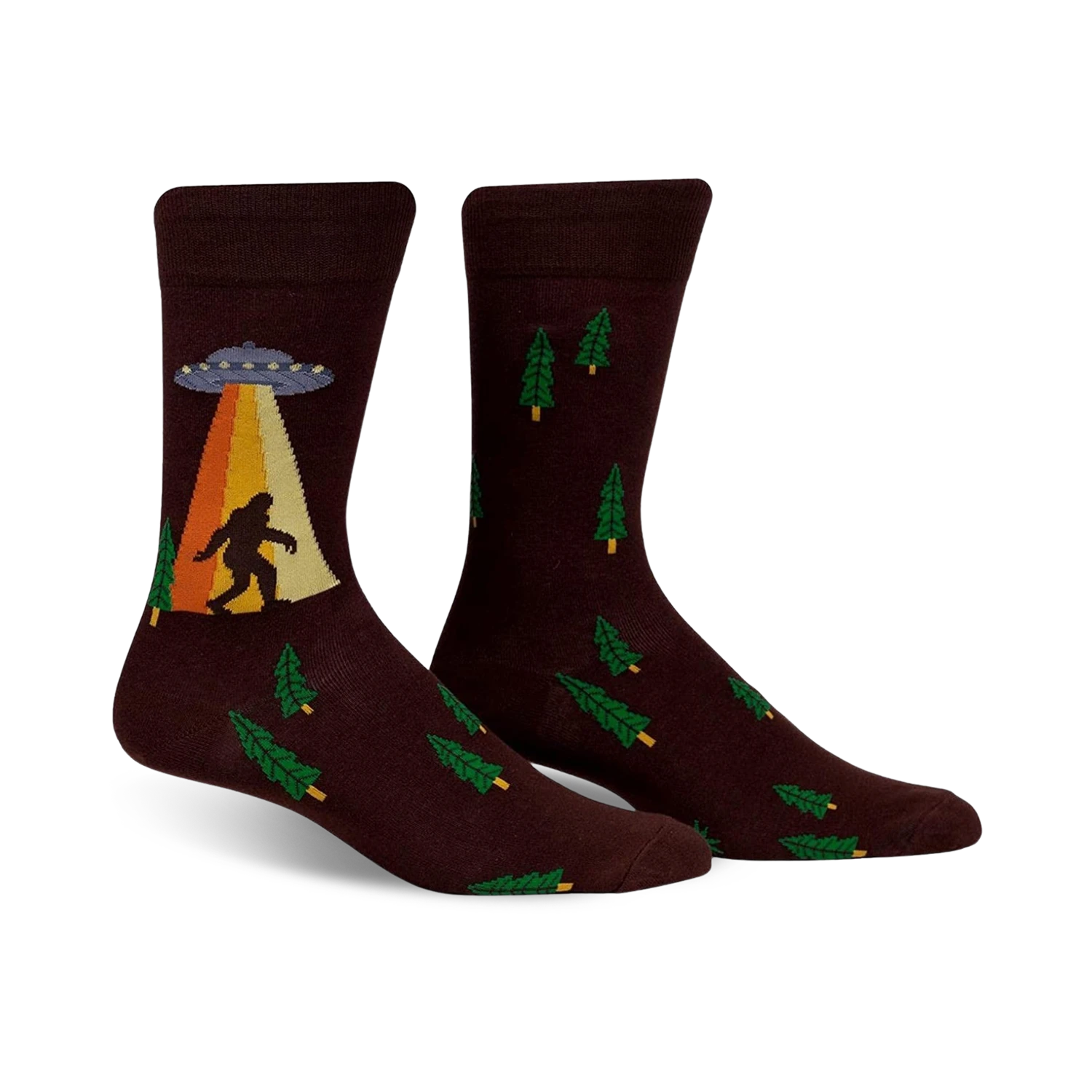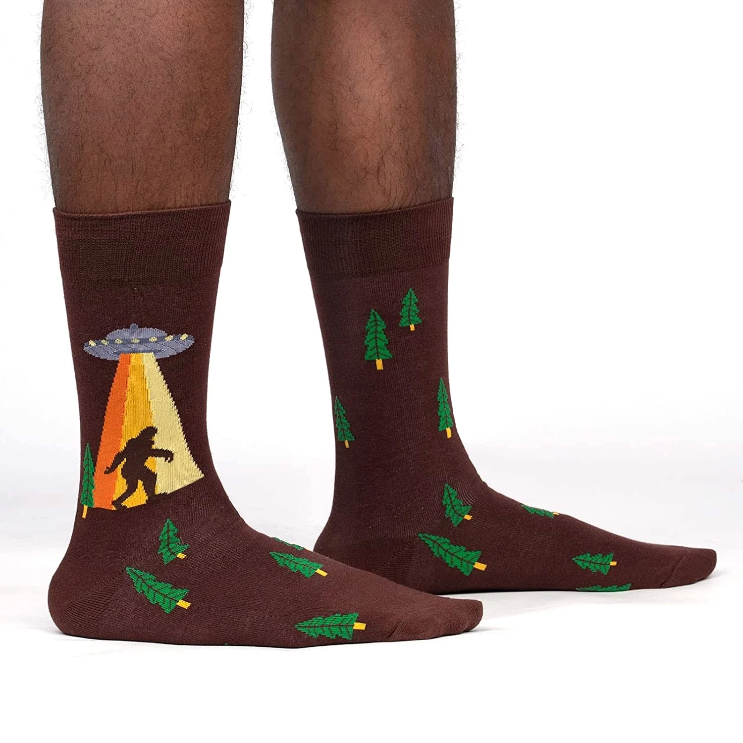 Calling all cryptozoologists and forest adventurers: these “Unbelievable” crew socks feature a brown backdrop adorned with green pine trees, a curious Bigfoot looking up at a UFO beaming light upon him. They’re ideal for any man seeking socks that combine mystery, humor, and comfort. Wear these socks and you might just find yourself on an out-of-this-world adventure!