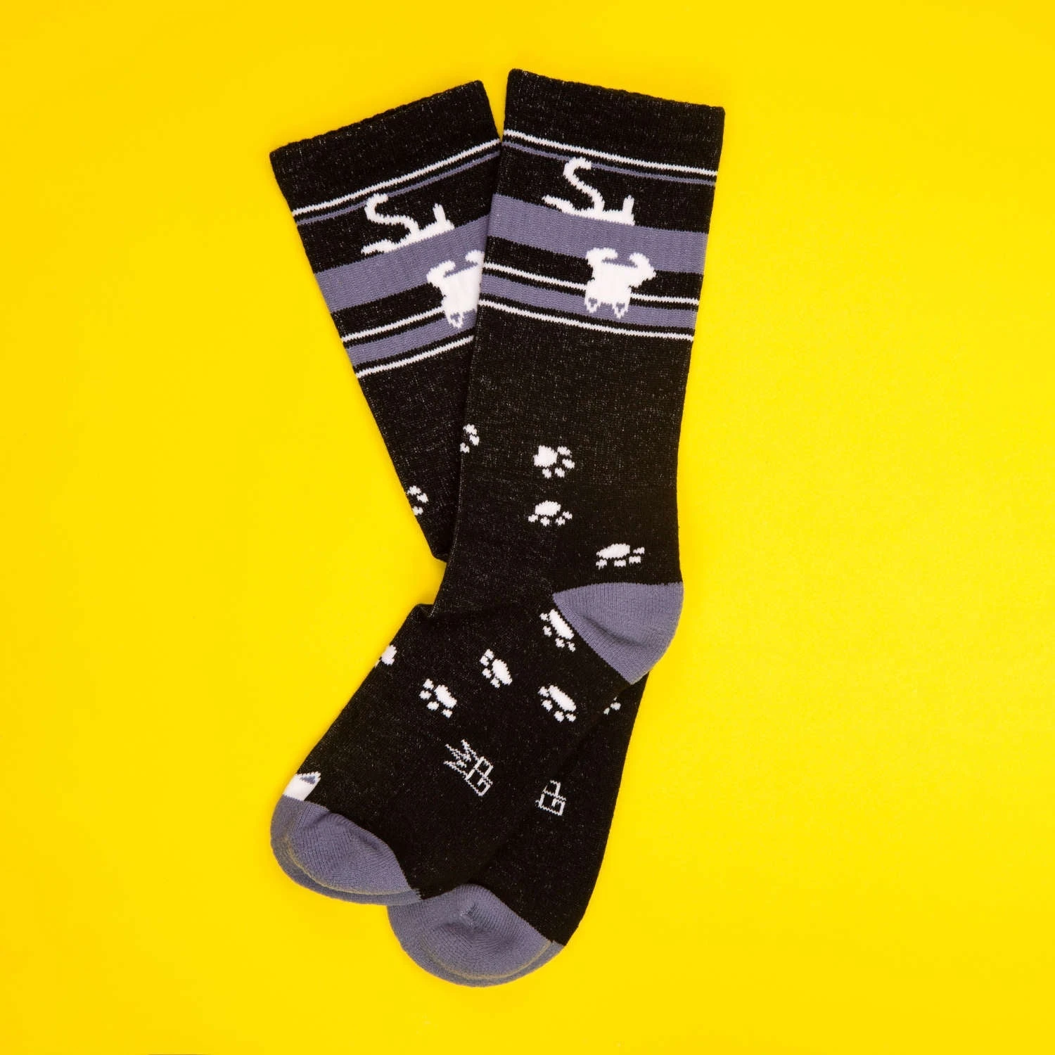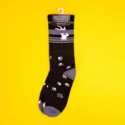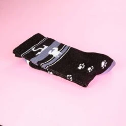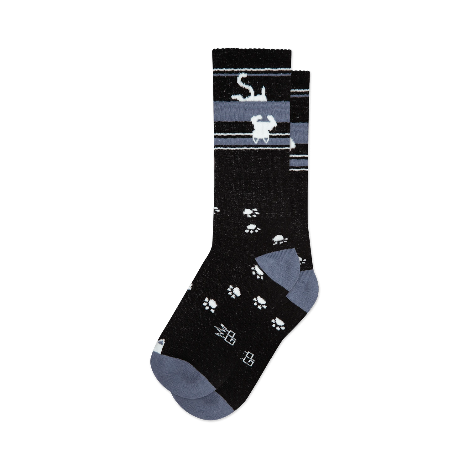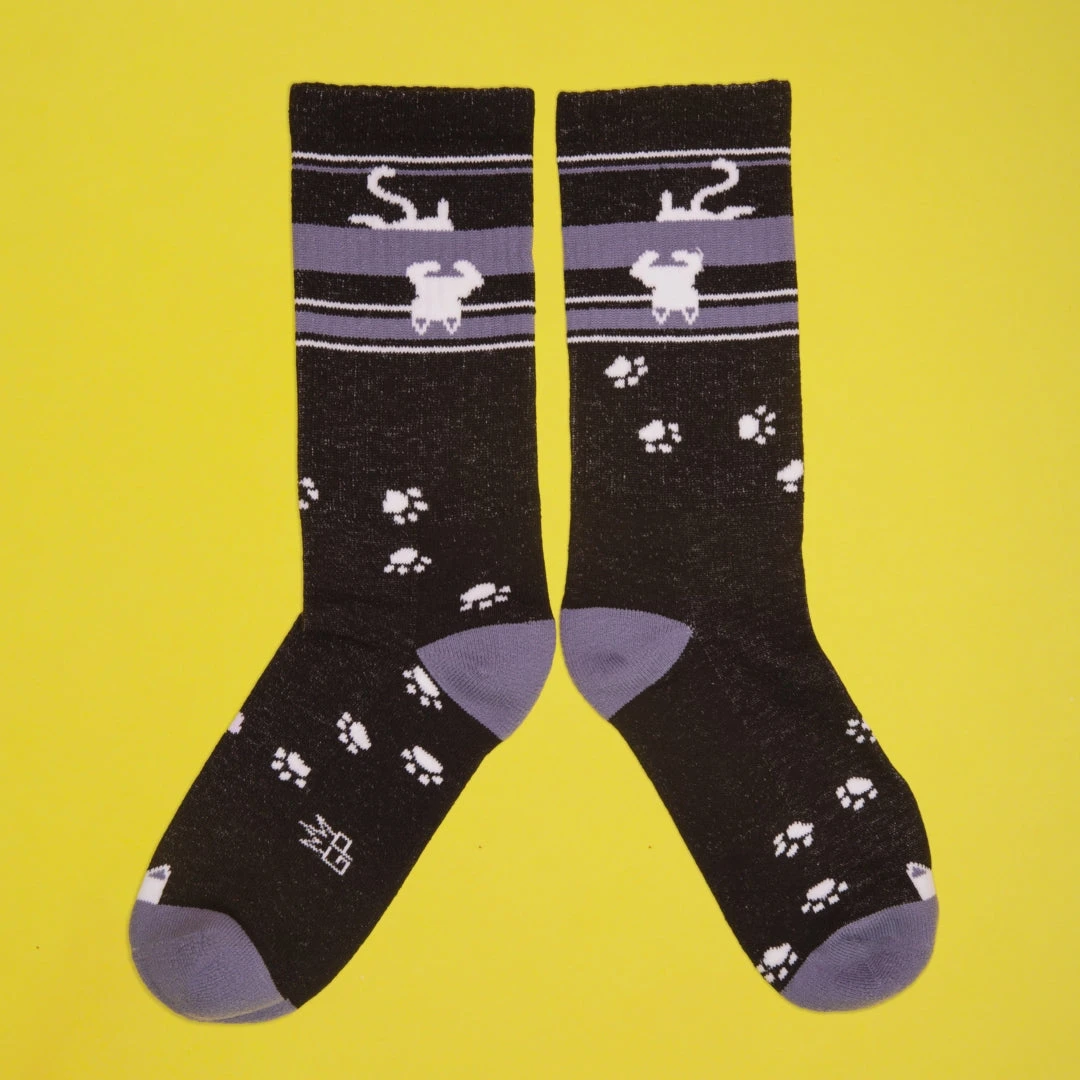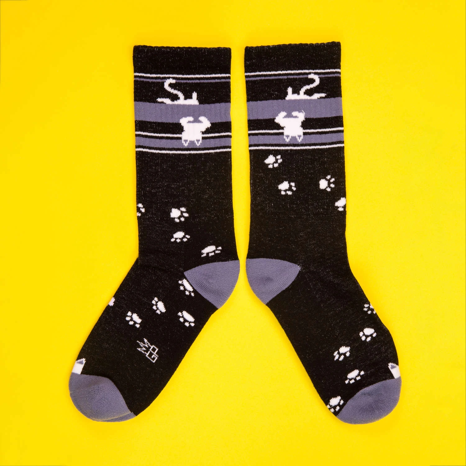 When cats decide to nap upside down, they redefine the meaning of relaxation. Embrace that carefree feline vibe with our Upside-Down White Cat gym socks, perfect for lounging or tackling your day with ease. These socks bring the ultimate blend of comfort and style, with soft cushioning and a playful cat print that adds a whisker of charm to any outfit. Made in the USA from a mix of Black Cotton with Optic White and Grey Nylon accents, they are designed to fit most feet comfortably, making them a purrfect addition to any wardrobe.