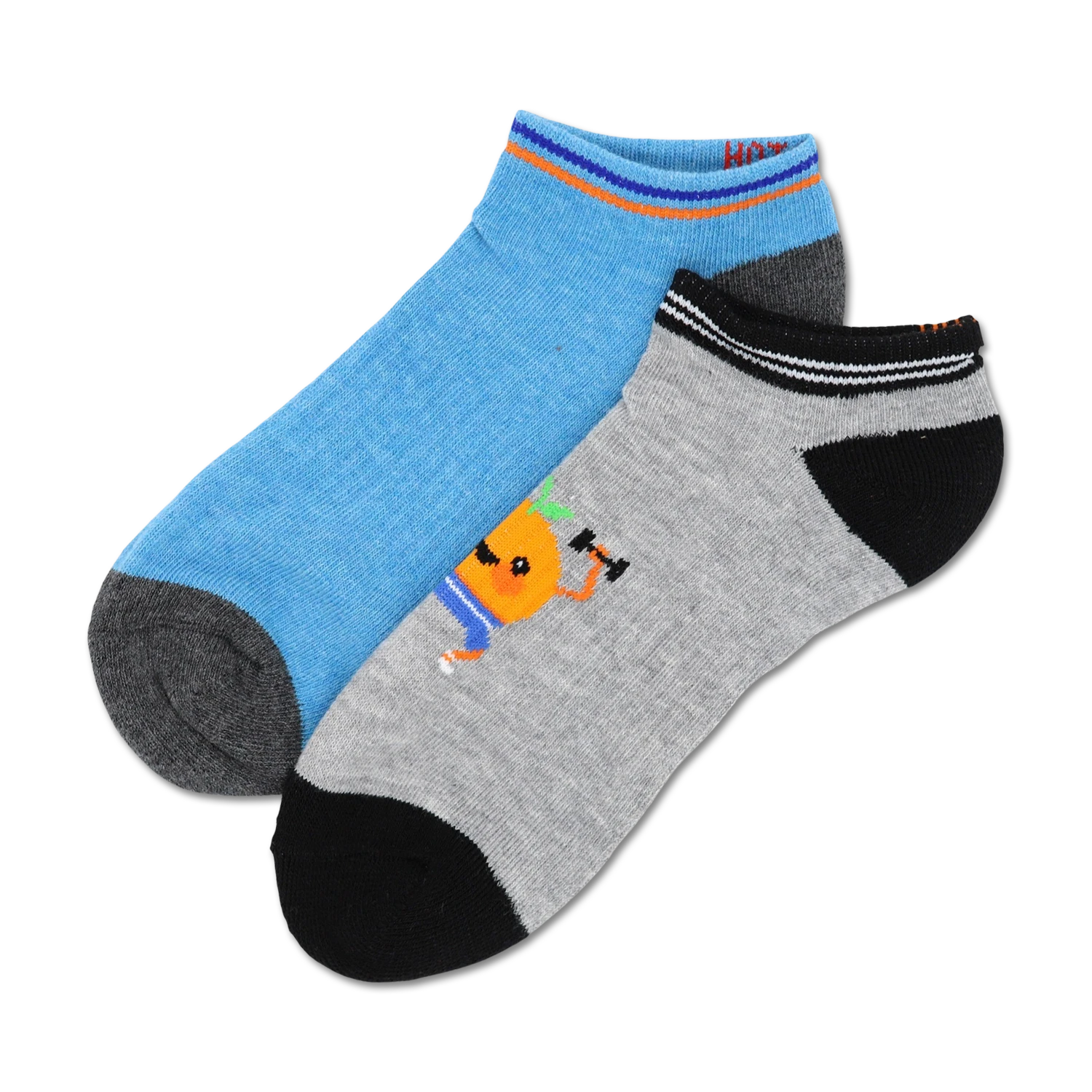 The Weight Lifting Orange 2 Pack socks are a bundle of fun and energy. One sock is light blue with dark blue and orange stripes, the other is gray with a cartoon orange crushing it at the gym. Just like Larry Wheels, these socks are made to withstand the toughest workouts whether you’re squatting, deadlifting, bench pressing, or just showing off your guns around town.