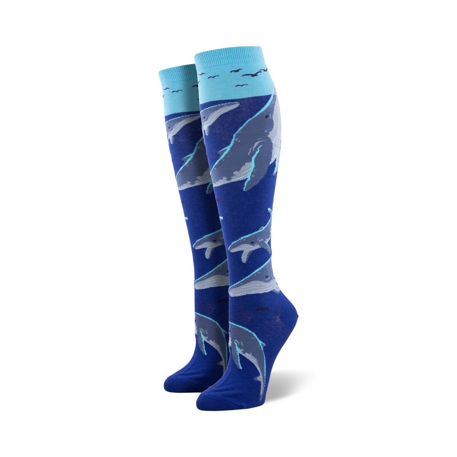 Dive into the deep blue with these Whale Watching knee-high socks for women! Picture this: a clear blue ocean with cartoon whales swimming about, topped off with light blue waves. These fun and funky socks are sure to make a splash wherever you go. Get ready to ride the waves of fashion and embrace your inner whale enthusiast. Let’s make waves and stand out from the school!