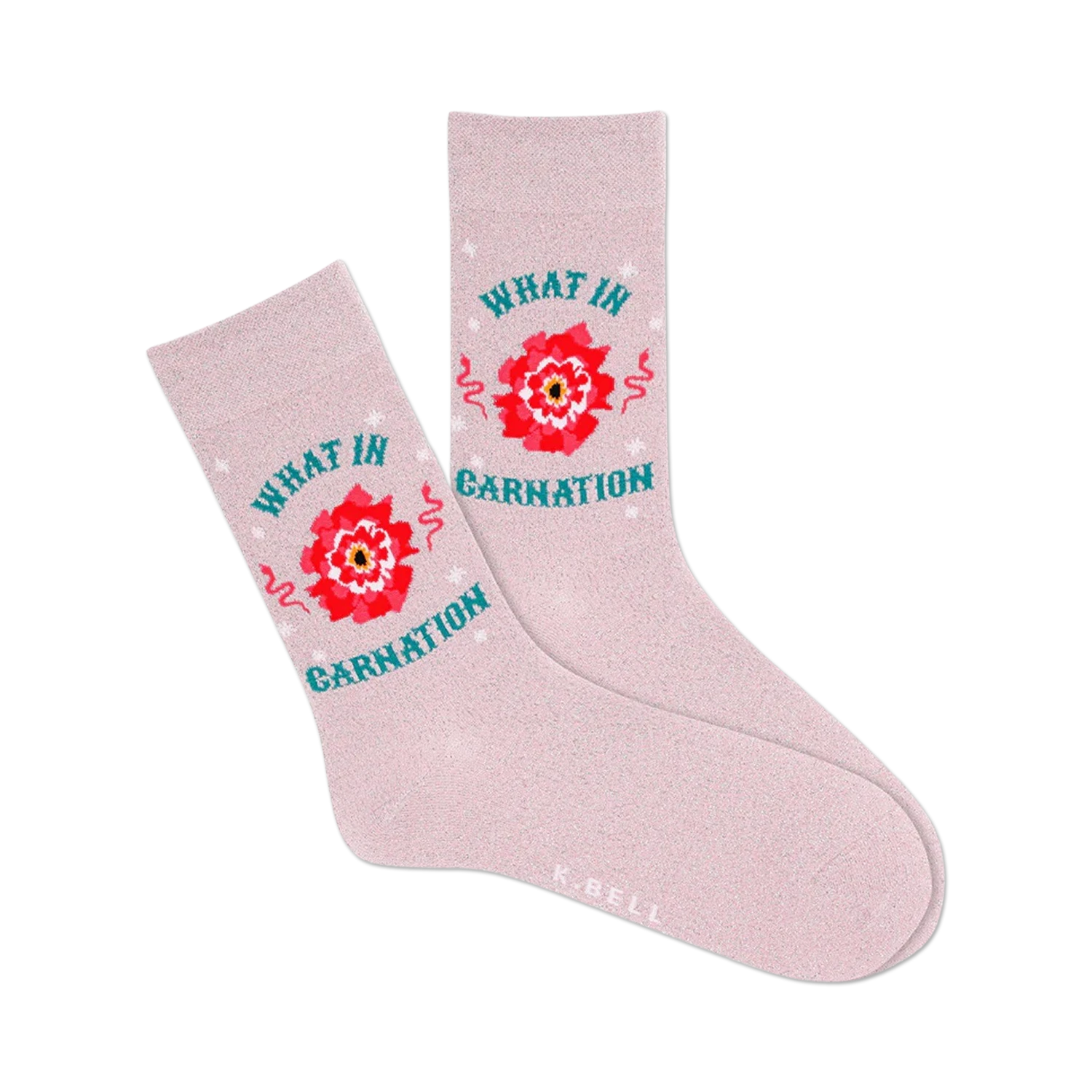 Get ready to bloom with style in our ‘What in Carnation’ socks! These crew length socks, designed for women, are adorned with a vibrant red carnation with a charming face, paired with the words ‘What in Carnation’. Made from soft, durable material, these socks will keep your feet cozy and stylish all day long. Let your feet make a statement and show off your love for flowers with these fun and flirty socks.