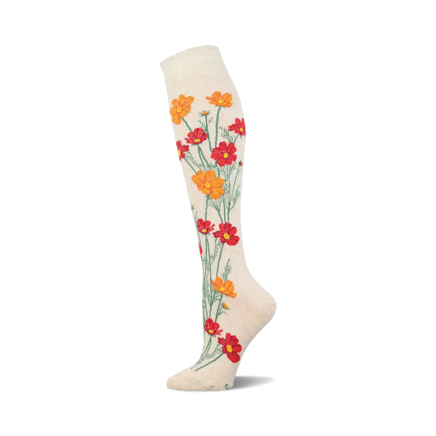 Some say persistence is key, but these knee-high socks prove that a splash of color and a bit of whimsy can take you anywhere you want to go. Adorned with vibrant orange and red flowers on a pristine white canvas, they remind us that beauty blooms in the most unexpected places. Perfect for those who dare to grow where others thought they couldnt, these socks are a cheerful testament to resilience and style.