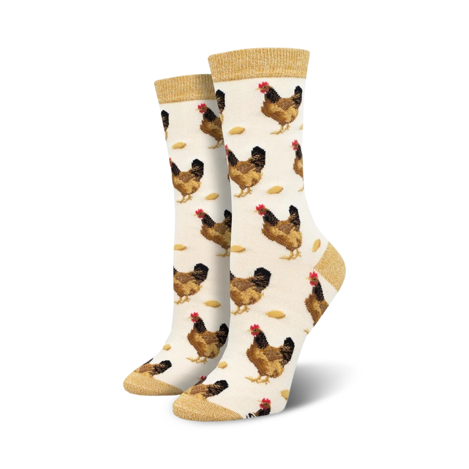 Unleash your inner chicken enthusiast with our “Which Came First? Bamboo” socks! These crew-length socks for women feature a whimsical pattern of brown hens and white eggs on a cream-colored background, topped with a golden touch. Embrace the age-old debate in style and show off your love for all things poultry. Prepare to have egg-cellent adventures and leave everyone clucking with laughter!