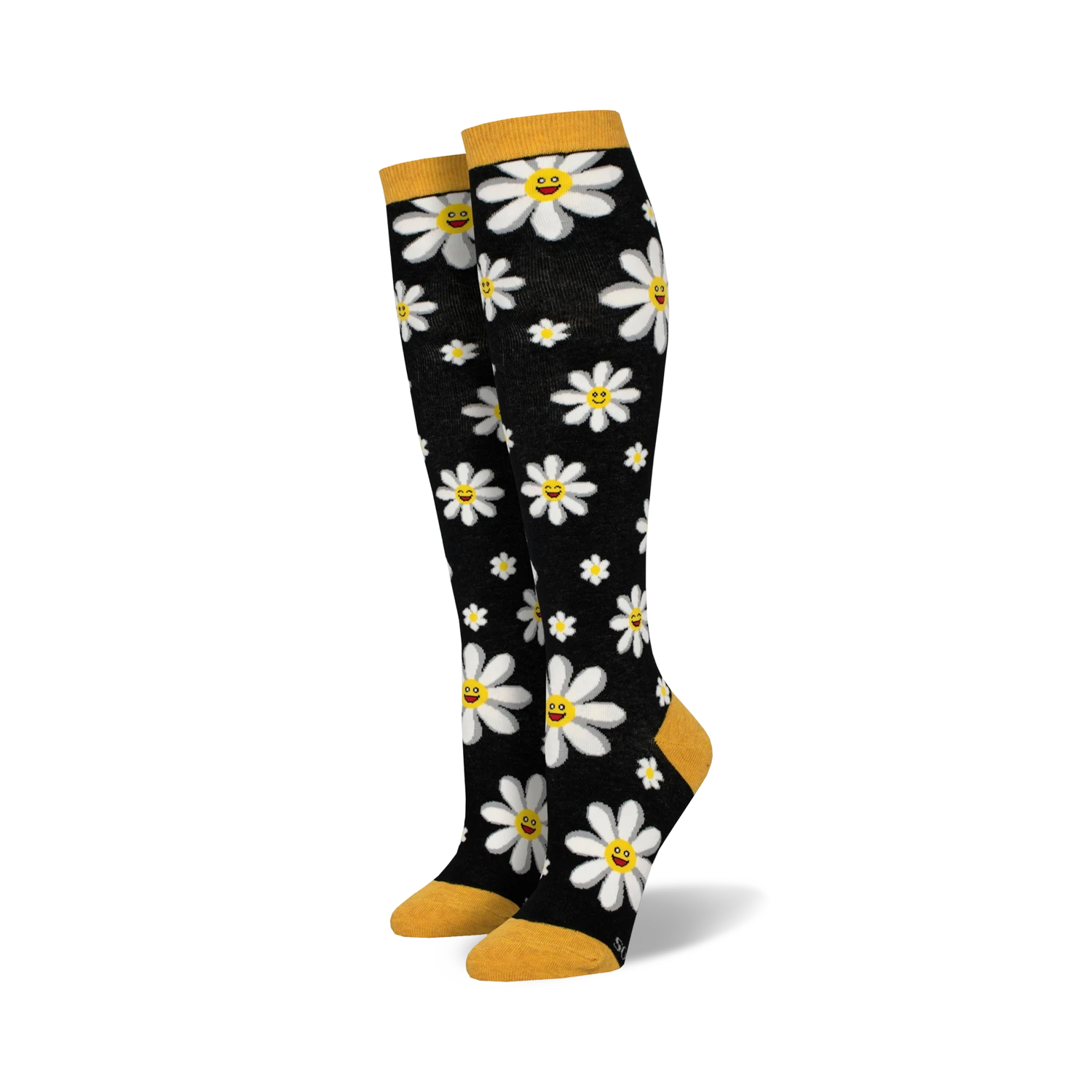 Whoopsy Daisy! These knee-high socks are a playful take on the classic daisy motif, with cartoonish white daisies blooming against a black background, each with a yellow center and a cheerful smiley face. The yellow cuffs and heels add a pop of color and fun, making these socks perfect for brightening up any outfit. With these Whoopsy Daisy socks on your feet, you’ll be sure to spread smiles wherever you go!