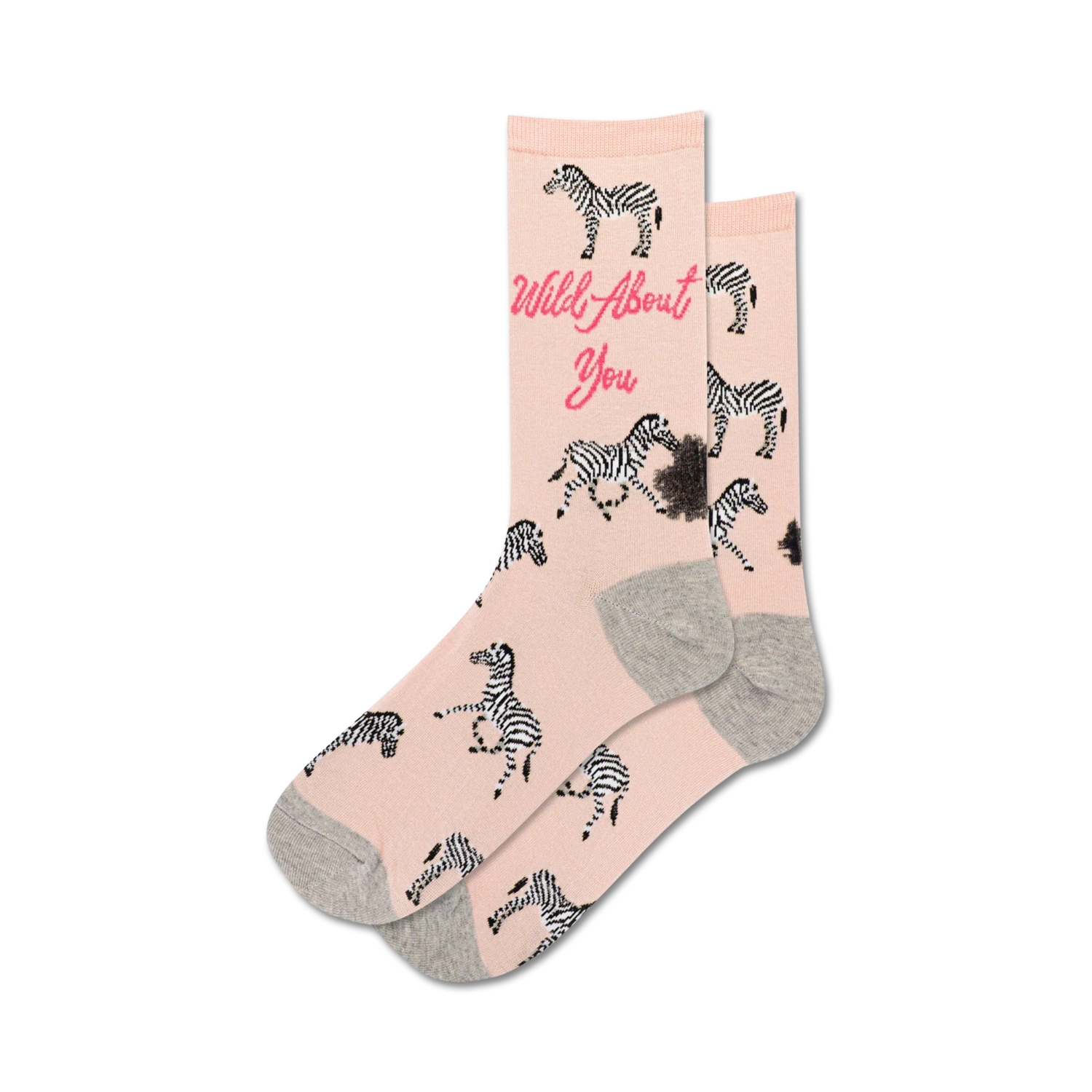 Get ready to go wild and let your feet lead the way in the “Wild About You” zebra socks! These crew-length, pink socks feature a striking pattern of fierce black and white zebras. With their playful “Wild About You” slogan, these socks are perfect for the playful fashionista with a zest for life. Slip on a pair of these and dare to stand out, whether you’re roaming the urban jungle or conquering your personal savannah. These socks are the ultimate symbol of resilience and style. So, get wild and embrace your inner zebra today!