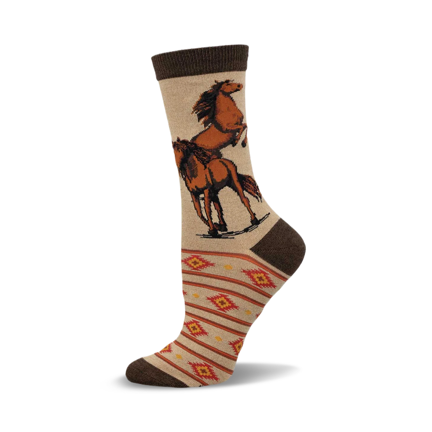 You know that feeling when the wind whips through your hair and you feel untamed and free? That’s the spirit embodied by these tan socks, adorned with a majestic brown horse design. With every stride, you channel the raw power and grace of wild horses, complemented by a vibrant red and yellow geometric pattern at the bottom. These socks are more than just a fashion statement; theyre an ode to the unbridled beauty of natures most poetic creatures.