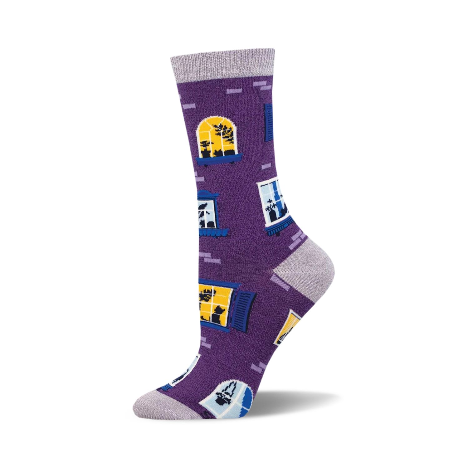 Brighten up your day and flaunt your feline flair with our Window Cats Bamboo socks! These crew-length charms feature playful cats peeking from vibrant blue and yellow windows, all set against a sleek purple background. Whether you’re lounging at home, tackling the office, or jazzing up your casual brunch outfit, these socks are purr-fect. Hosting a cat-themed party? Don’t forget your socks! Why not make every step a statement with a splash of color and a dash of whimsy? Go on, let your paws do the talking and grab a pair today!