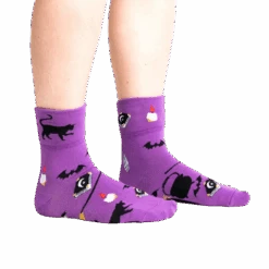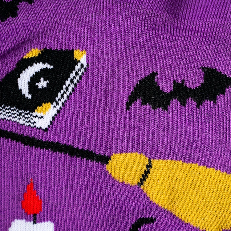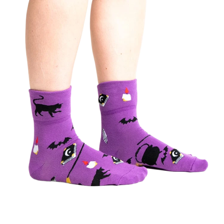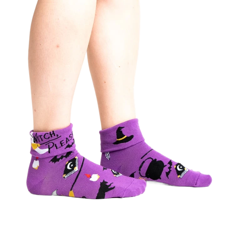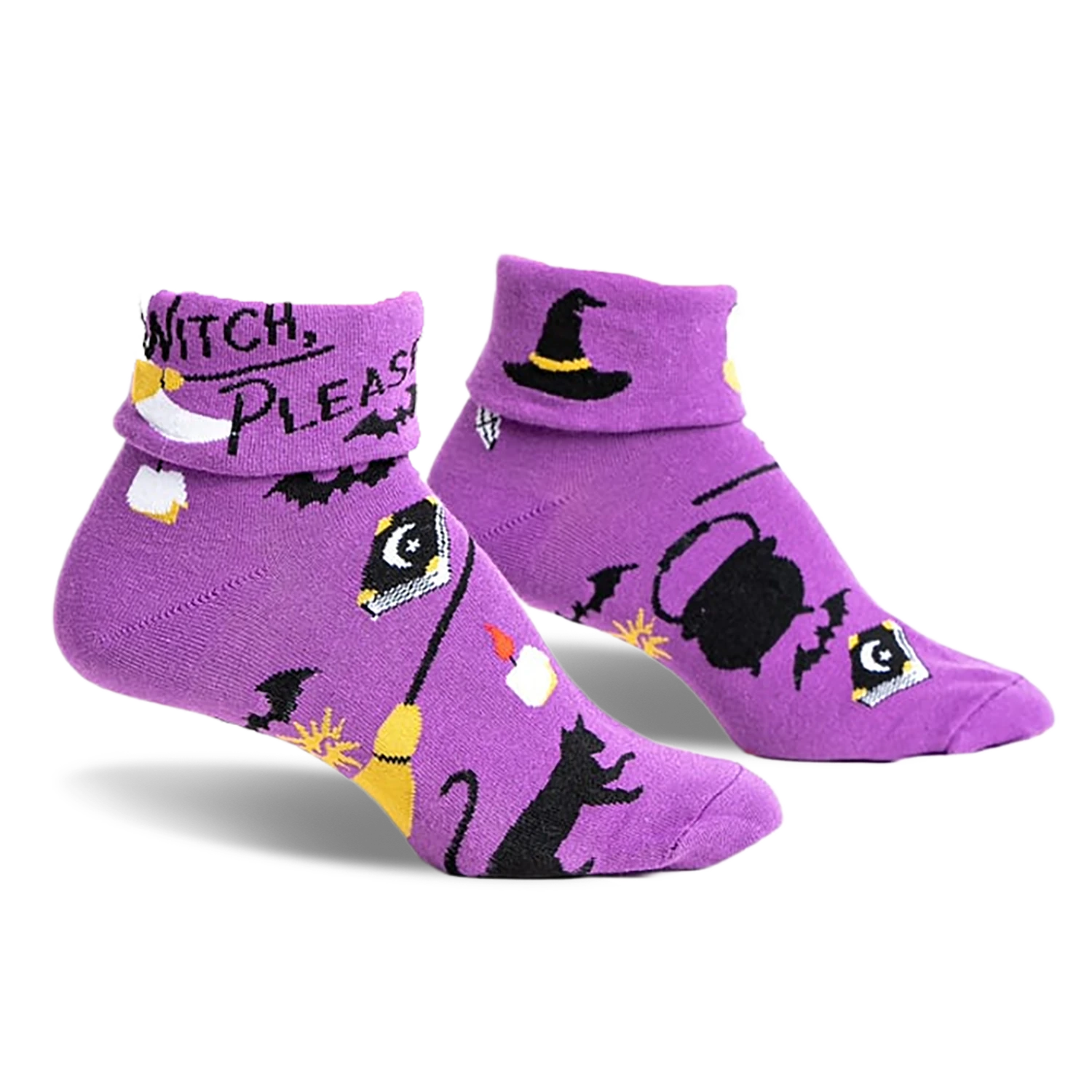 Ever wonder what a dash of whimsy and a sprinkle of sorcery could do for your wardrobe? Enter our witch turn cuff socks, where style meets spellbinding charm. These purple wonders are adorned with a cheeky black cat, a mystical witch’s hat, a bubbling cauldron, and a trusty broom. And let’s not forget the sassy “witch please” emblazoned across the front, making these socks the perfect accessory for conjuring up some fashion magic.