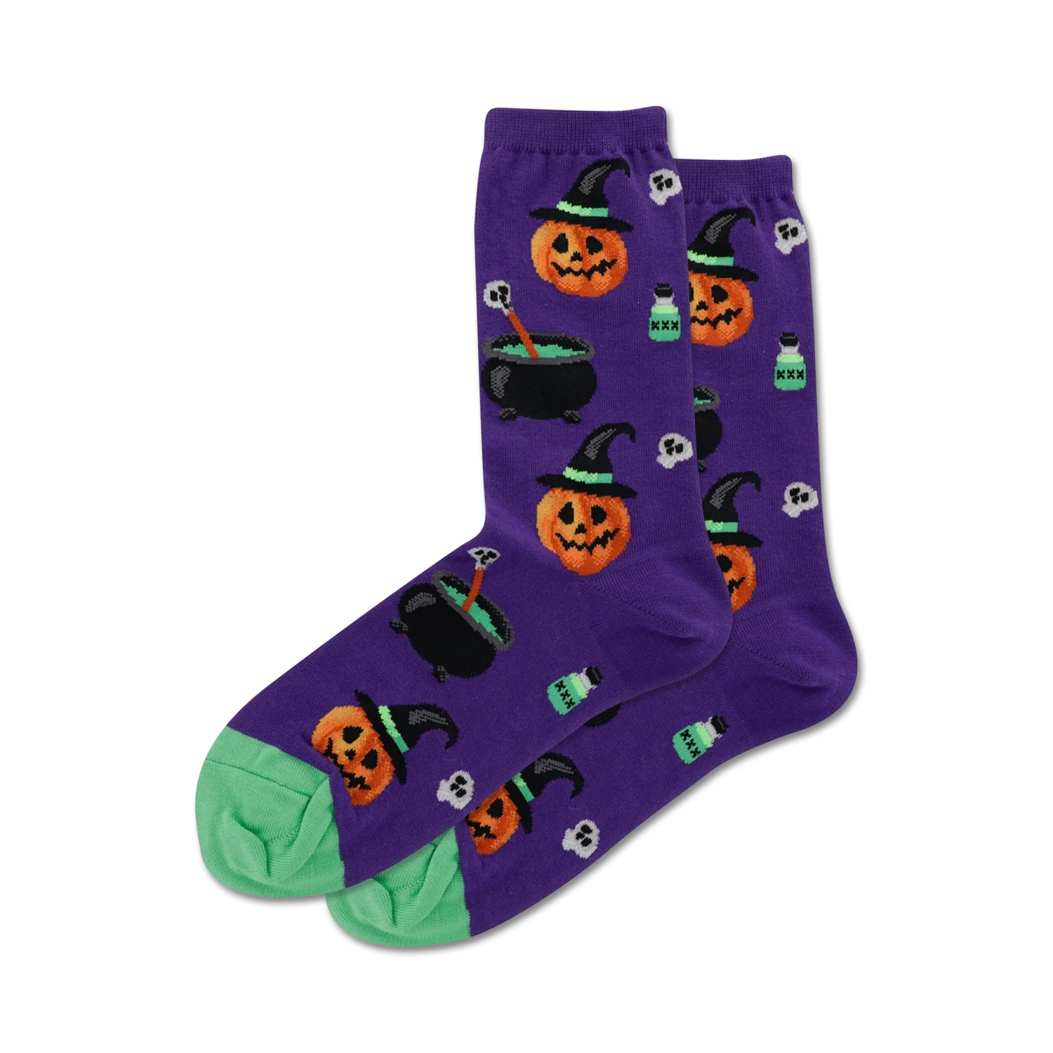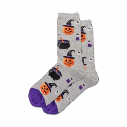 Halloween has never been so spooky and fashionably fierce than with these Witch Pumpkin socks! Experience a wickedly adorable design with vibrant pumpkins, witches’ hats, purple stripes, and bubbling cauldrons on gray your feet will be downright spellbinding. Prepare to cast a hex on your sock drawer!