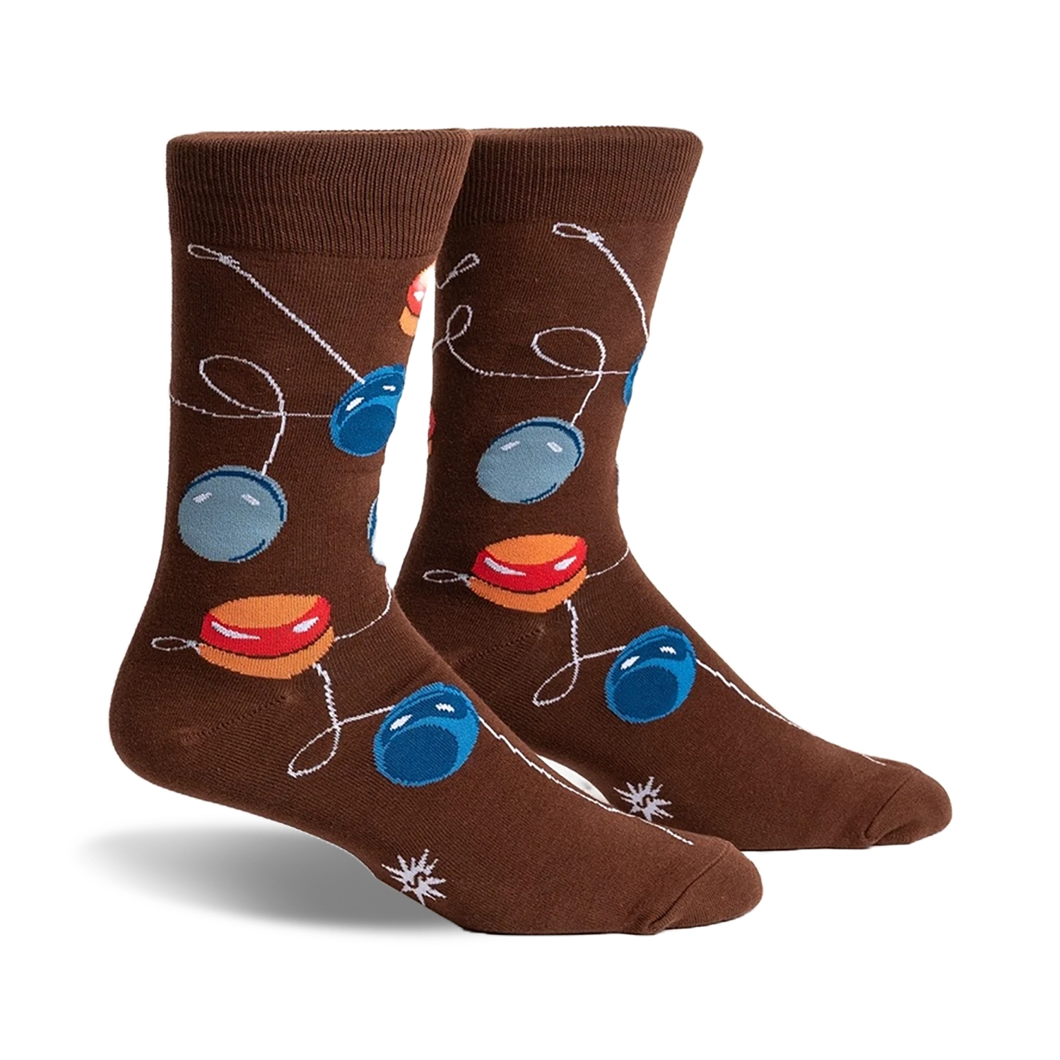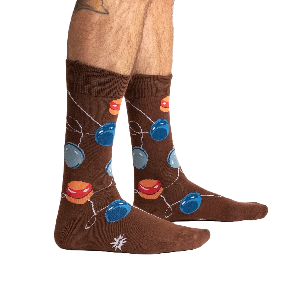 Yo-Yoing Around: Keep Your Feet Happy and Stylish with These Energetic Retro Socks Yo-Yoing Around with these awesome crew socks for men! Have a ball and let your feet do the walking in style with these yo-yo socks. Featuring a colorful collection of bright red, blue, and yellow yo-yos, connected by a white string, these socks are a playful way to add some fun to your everyday look. Whether you’re a seasoned pro or just starting out, these socks are sure to make you smile and are guaranteed to become your new favorites.