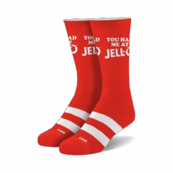 Looking for a way to sprinkle some fun into your everyday attire? Slip into the delightfully charming “You Had Me At Jell-O” socks, and let the laughs follow wherever you tread. These crew-length socks are a blast of bright red with snazzy white stripes and whimsical wording that can’t help but conjure smiles. Perfect for lounging or as a quirky conversation starter at parties, these socks are a must-have for those who love to combine comfort with a touch of playful flair. Why wear boring socks when you can make a jelly-good statement?